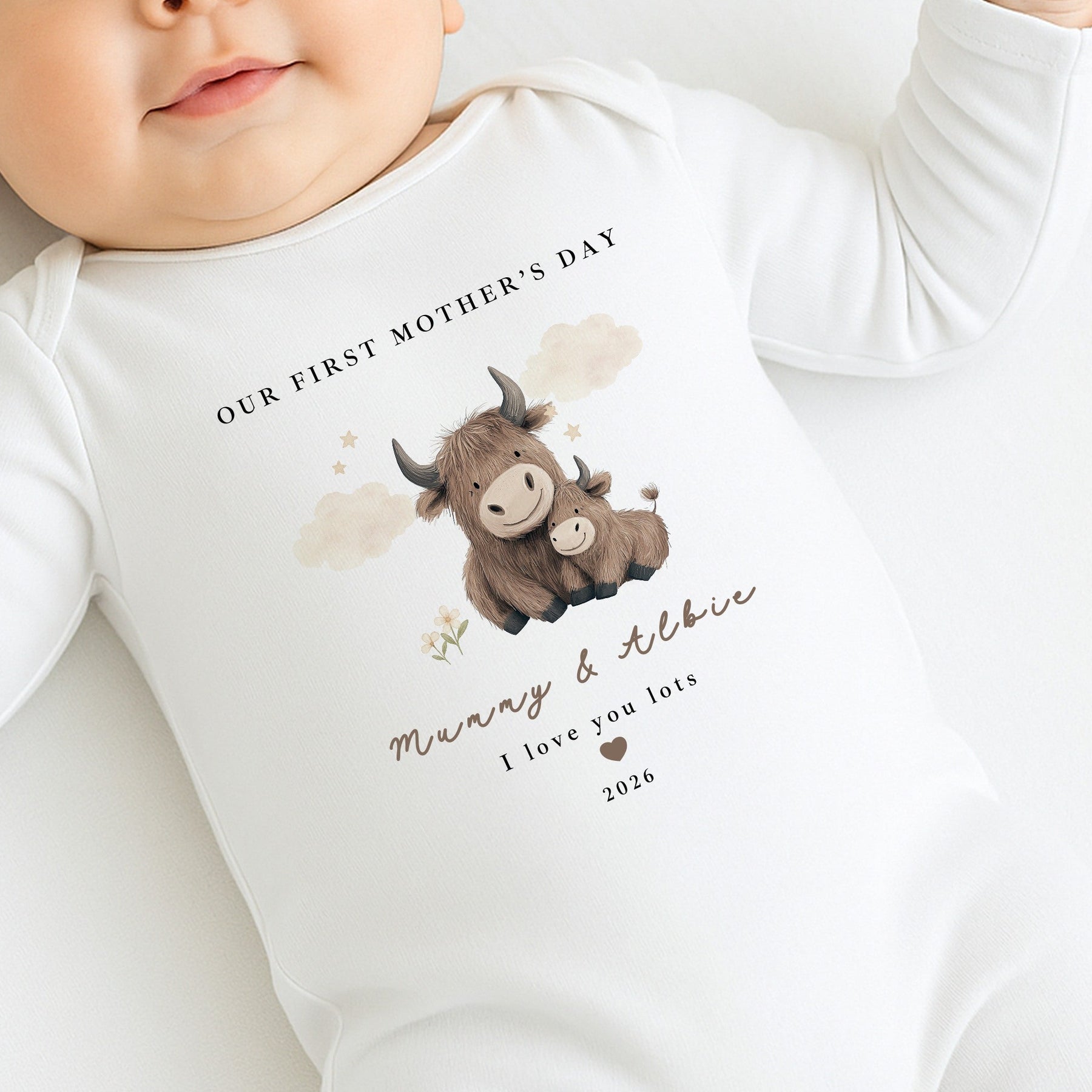 Celebrate Our First Mother’s Day with this adorable personalised baby outfit, featuring a sweet mummy and baby cow illustration in soft neutral tones. Designed to mark a shared milestone between Mum and baby, this keepsake is available as a babygrow, vest or bib and makes a thoughtful first Mother’s Day gift that’s perfect for new mums.