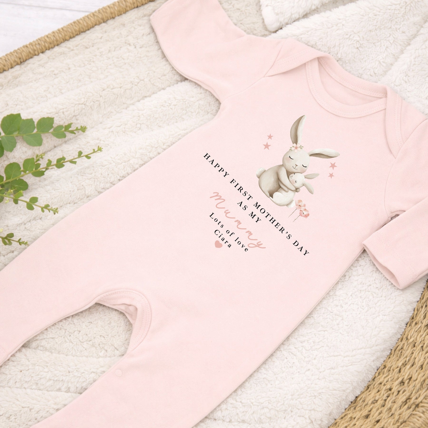 Celebrate My First Mother’s Day with this beautifully illustrated personalised baby outfit, featuring a soft mummy and baby bunny design with delicate pink floral details. Available as a babygrow, vest or bib, this item makes a heartfelt keepsake from baby to Mum — perfect for a new mum, first time mummy, or to mark our first Mother’s Day together. Suitable for baby girl or baby boy.
