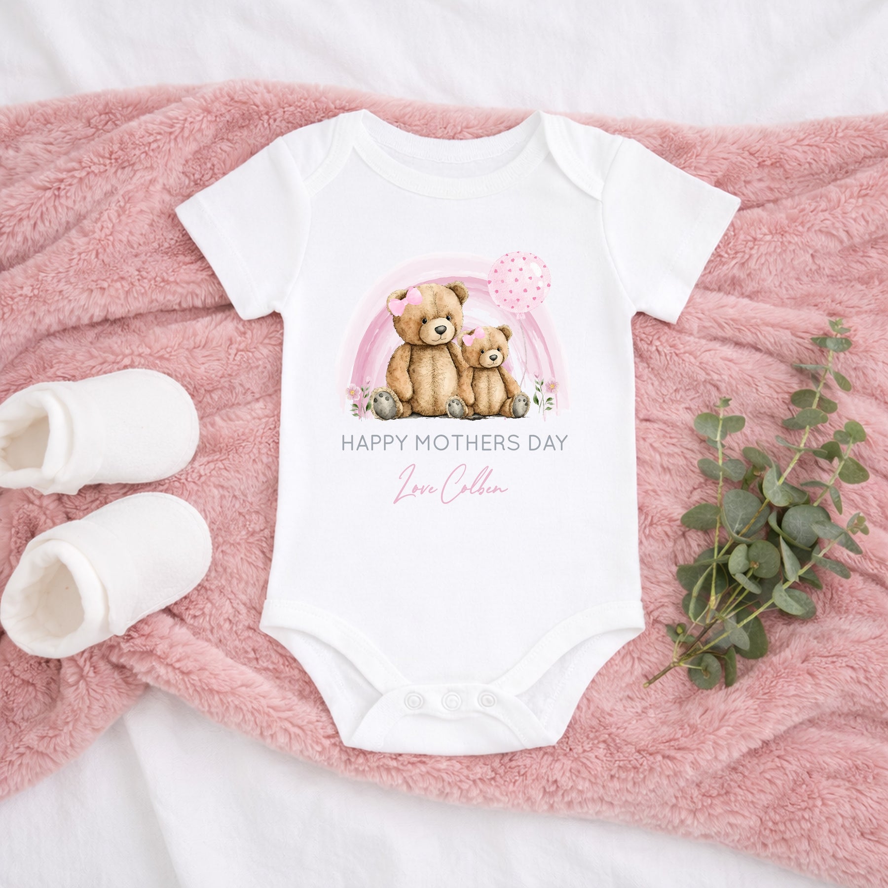 Personalised Pink Teddy Rainbow Happy Mother's Day Baby Grow or Vest