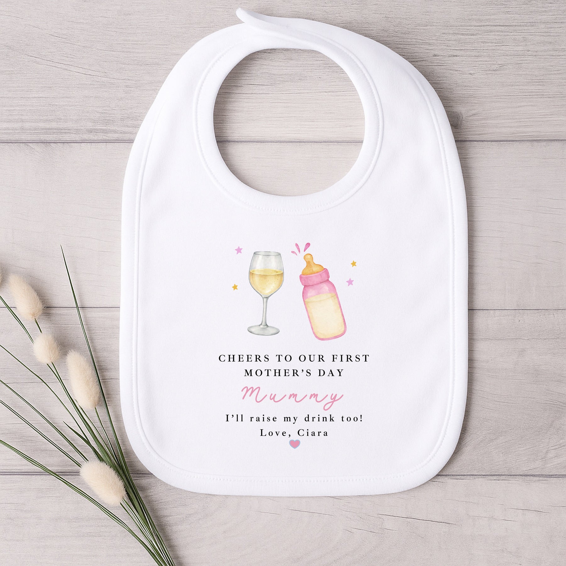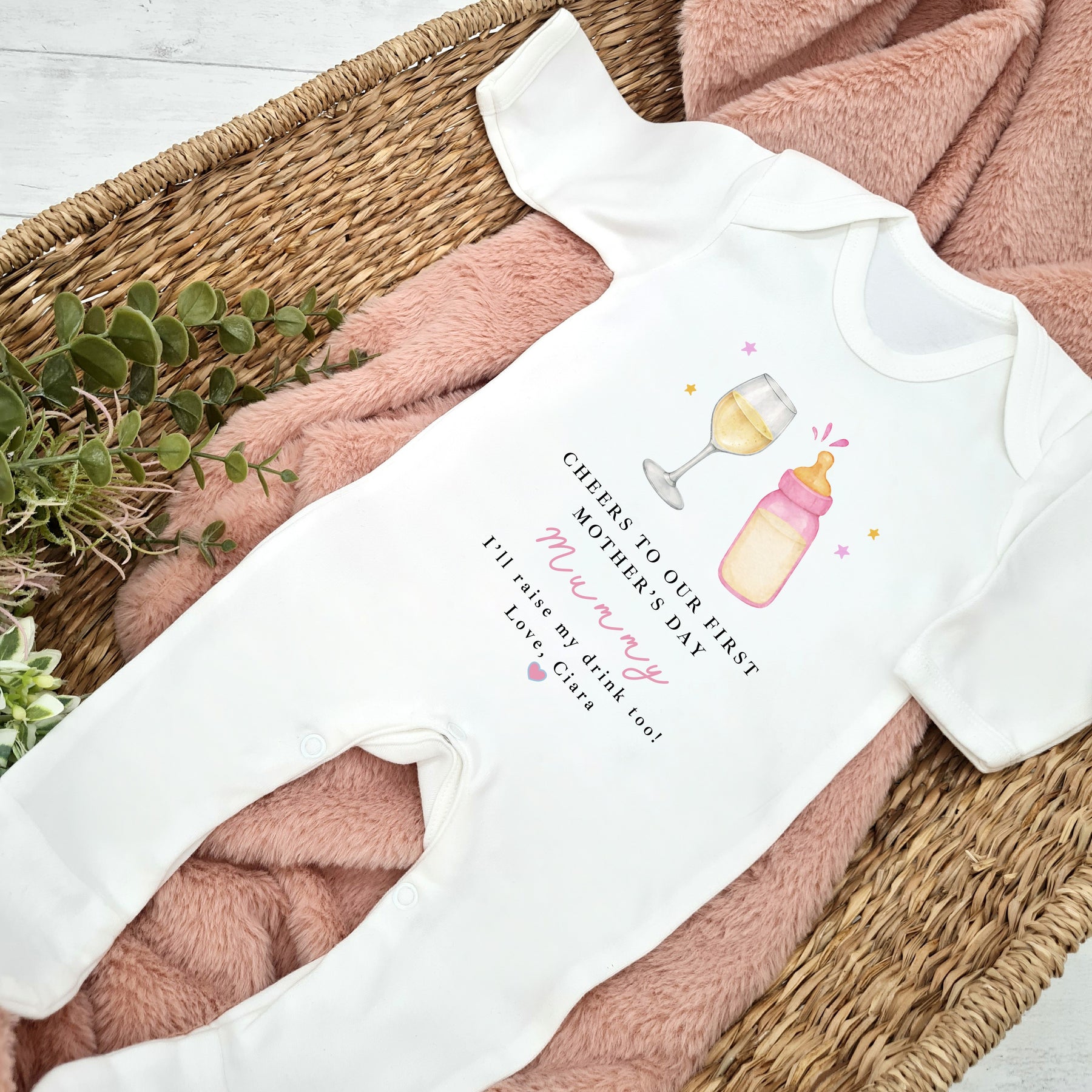 Personalised Pink Wine Cheers Our First Mother's Day Baby Grow, Vest or Bib