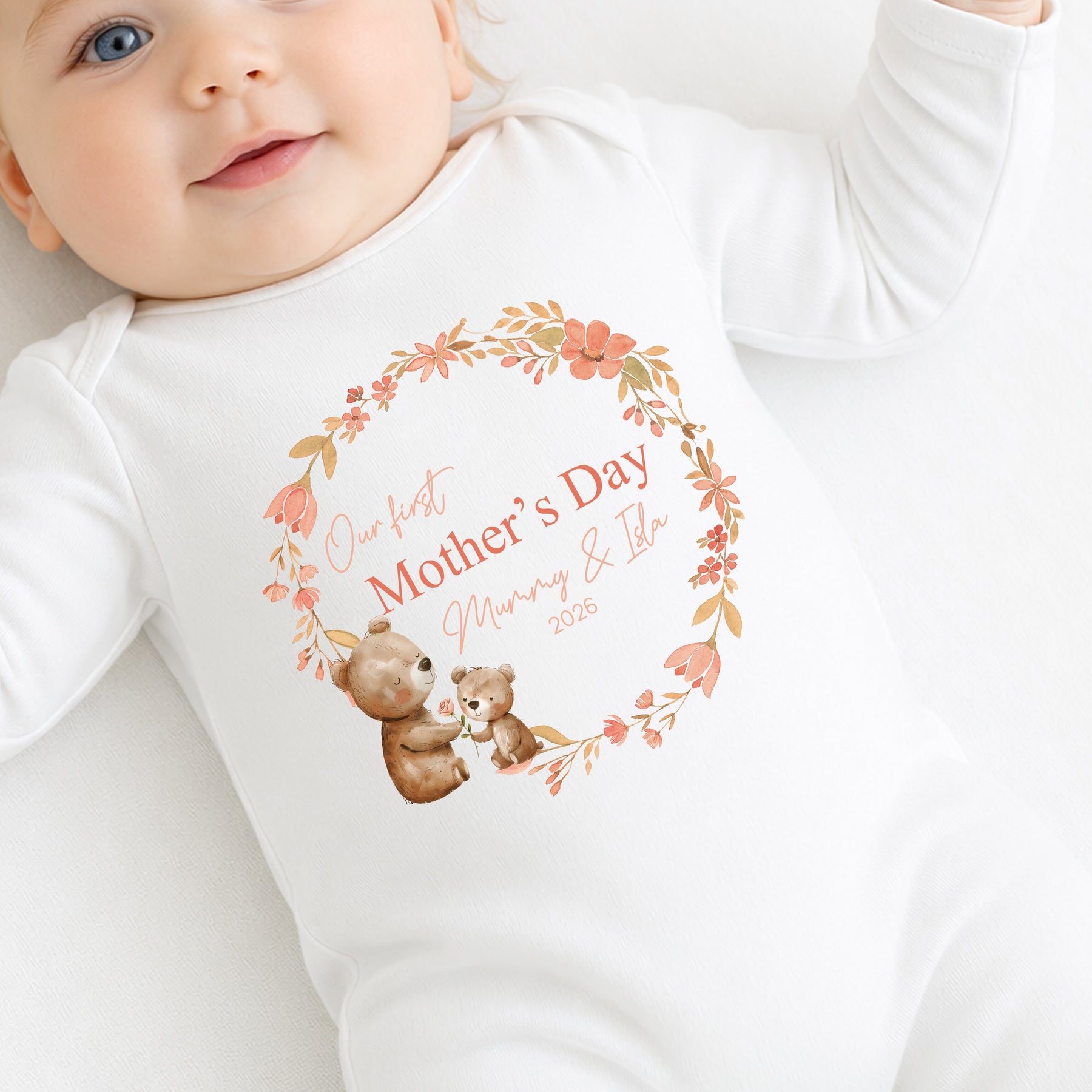 This listing is for one item only, allowing you to choose either a babygrow, vest or bib at checkout. Sizes are available from tiny baby up to 18–24 months, and each item is personalised with names as shown. A timeless and heart-warming Our First Mother’s Day baby outfit Mum will cherish long after the day has passed.