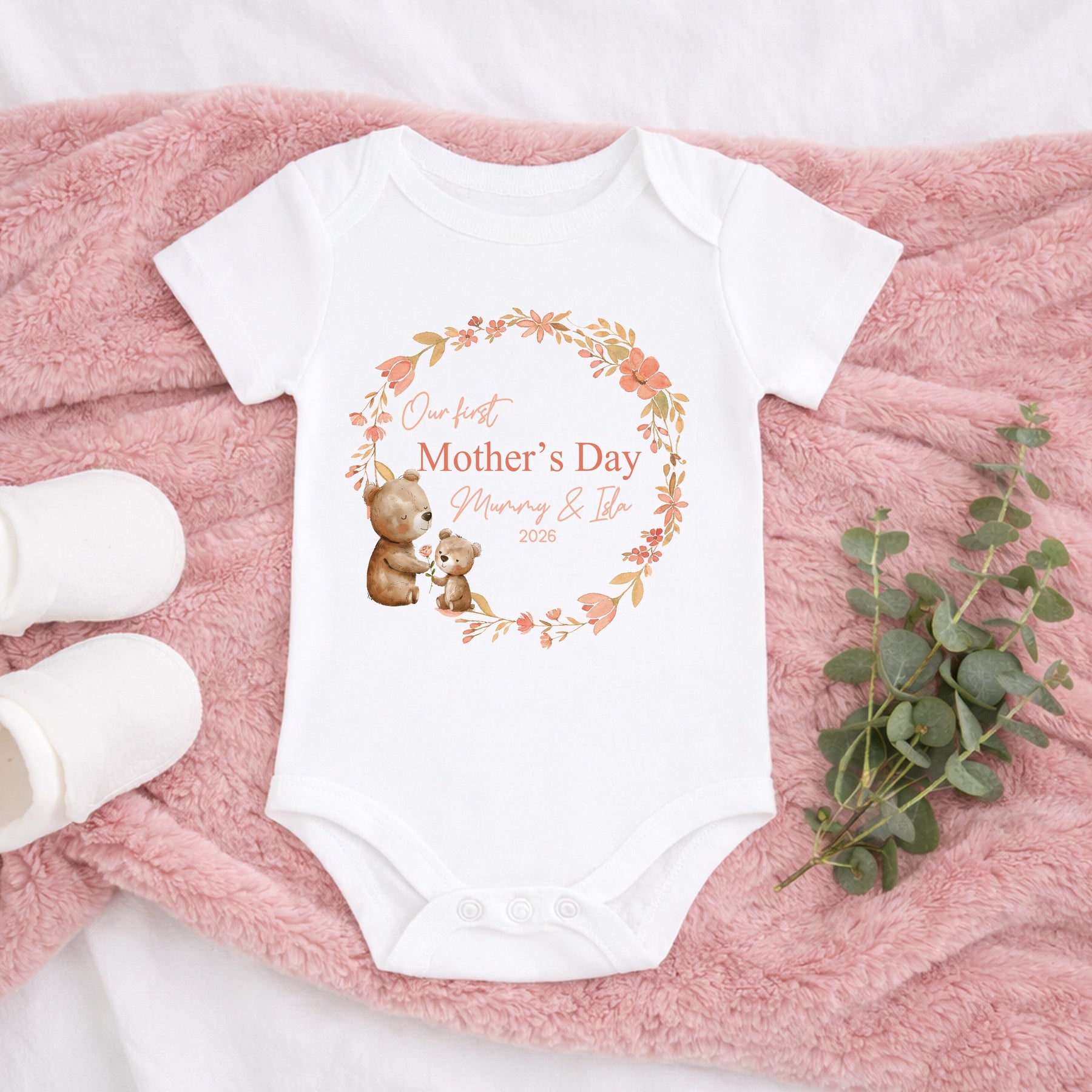 Personalised Teddy Wreath Our First Mother's Day Baby Grow, Vest or Bib