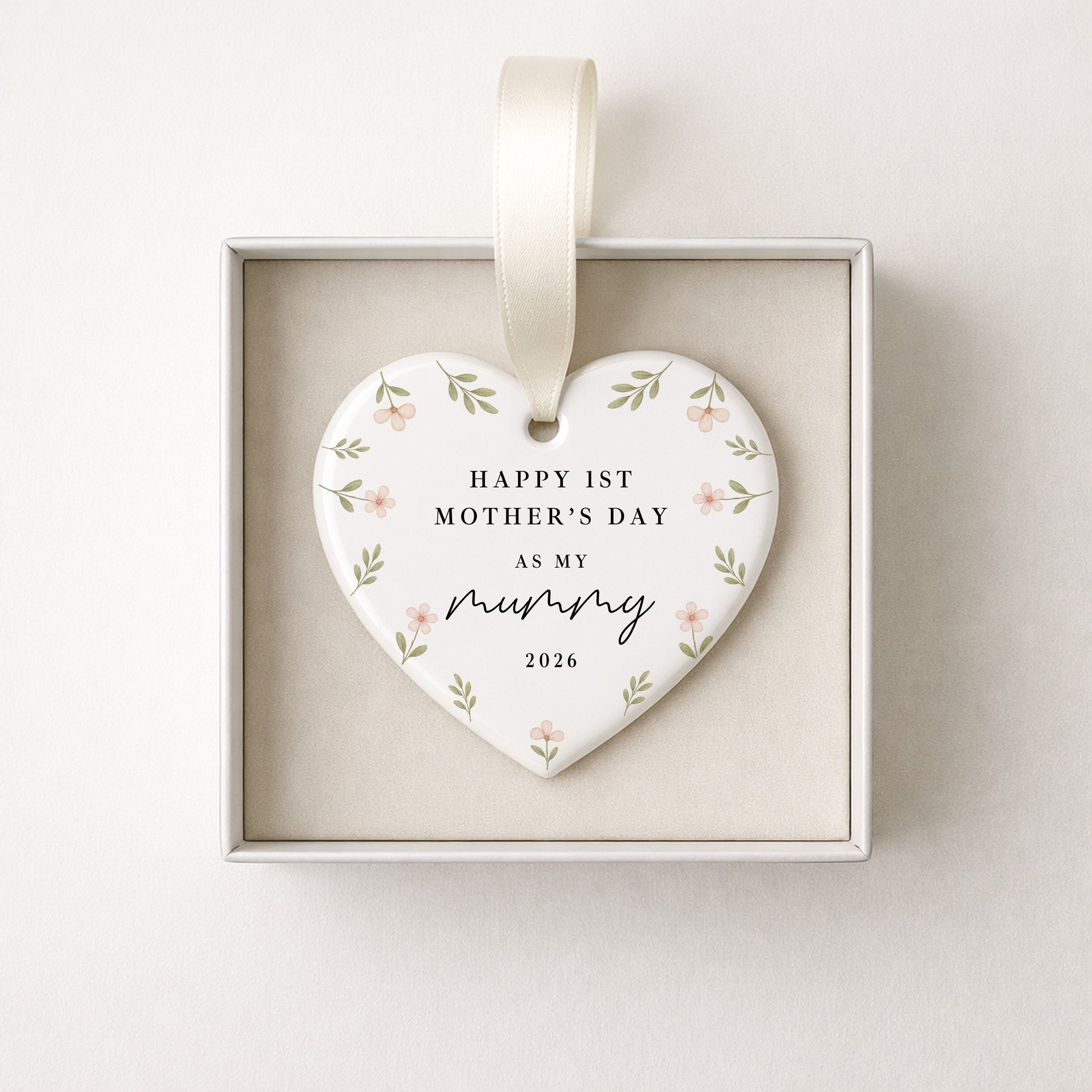 This ceramic heart ornament is designed to celebrate a first Mother’s Day, featuring the message “Happy 1st Mother’s Day as my mummy” with a delicate floral wreath design. A meaningful keepsake to mark becoming a mum, it’s ideal as a first Mother’s Day gift or a sentimental new mum keepsake.