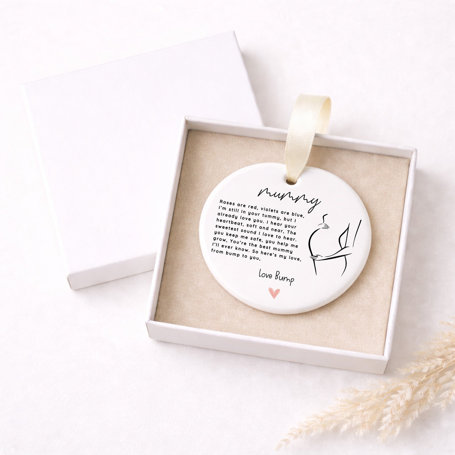This round ceramic ornament features a heartfelt poem from baby to Mummy, ending with “love Bump” and a delicate bump illustration. Designed as a pregnancy keepsake, it’s a meaningful mum to be gift celebrating the bond formed before baby arrives.