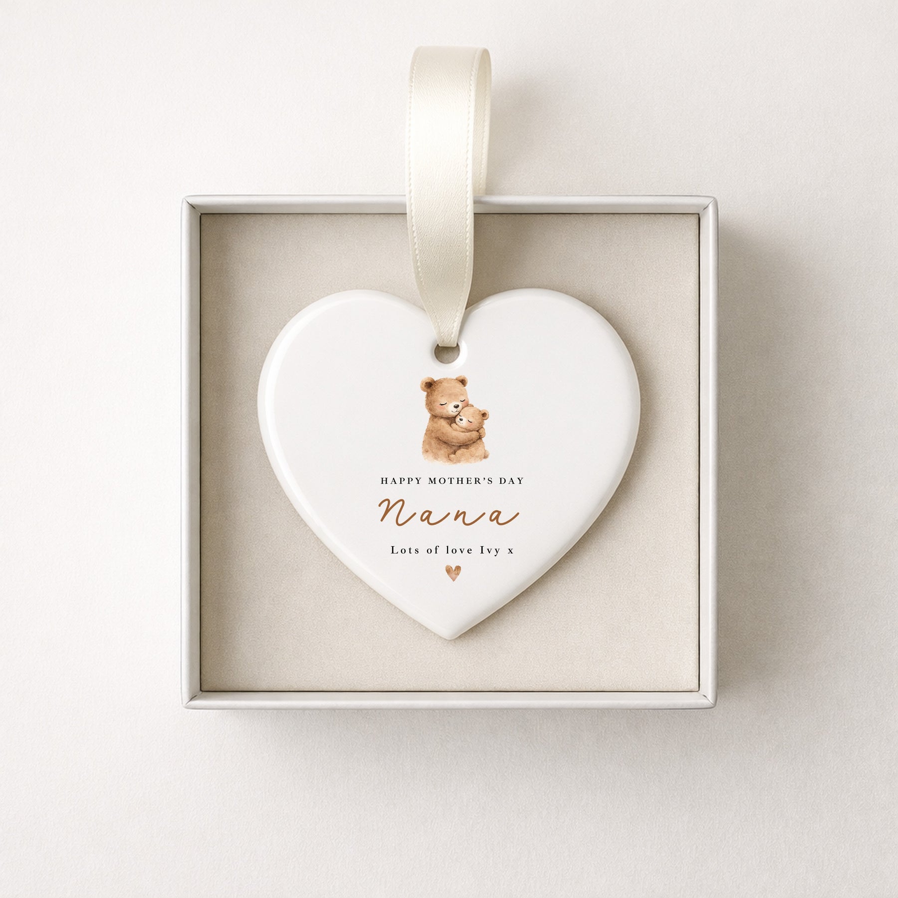 This personalised ceramic heart ornament is designed as a Mother’s Day gift for Nana, featuring the wording “Happy Mother’s Day Nana” with a sweet mummy and baby bear illustration. Finished with a personalised name sign-off, it’s a meaningful keepsake to celebrate a much-loved Nana or Grandma.