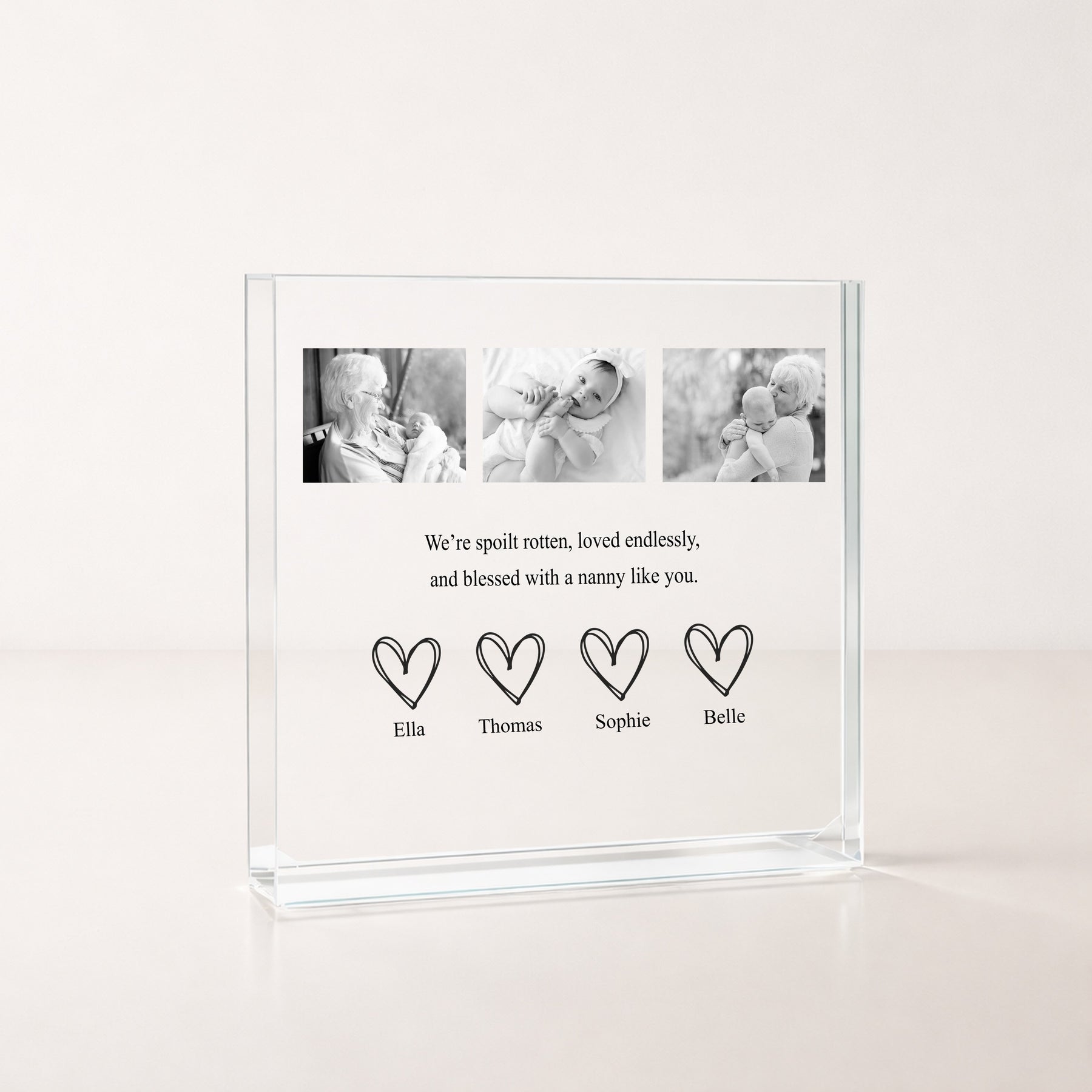 This personalised Nanny photo Mother’s Day gift is a sentimental UV acrylic photo block designed to celebrate a much-loved nanny. Featuring multiple photos, a heartfelt message, and personalised children’s names, this keepsake makes a meaningful Mother’s Day gift for Nanny from grandchildren.