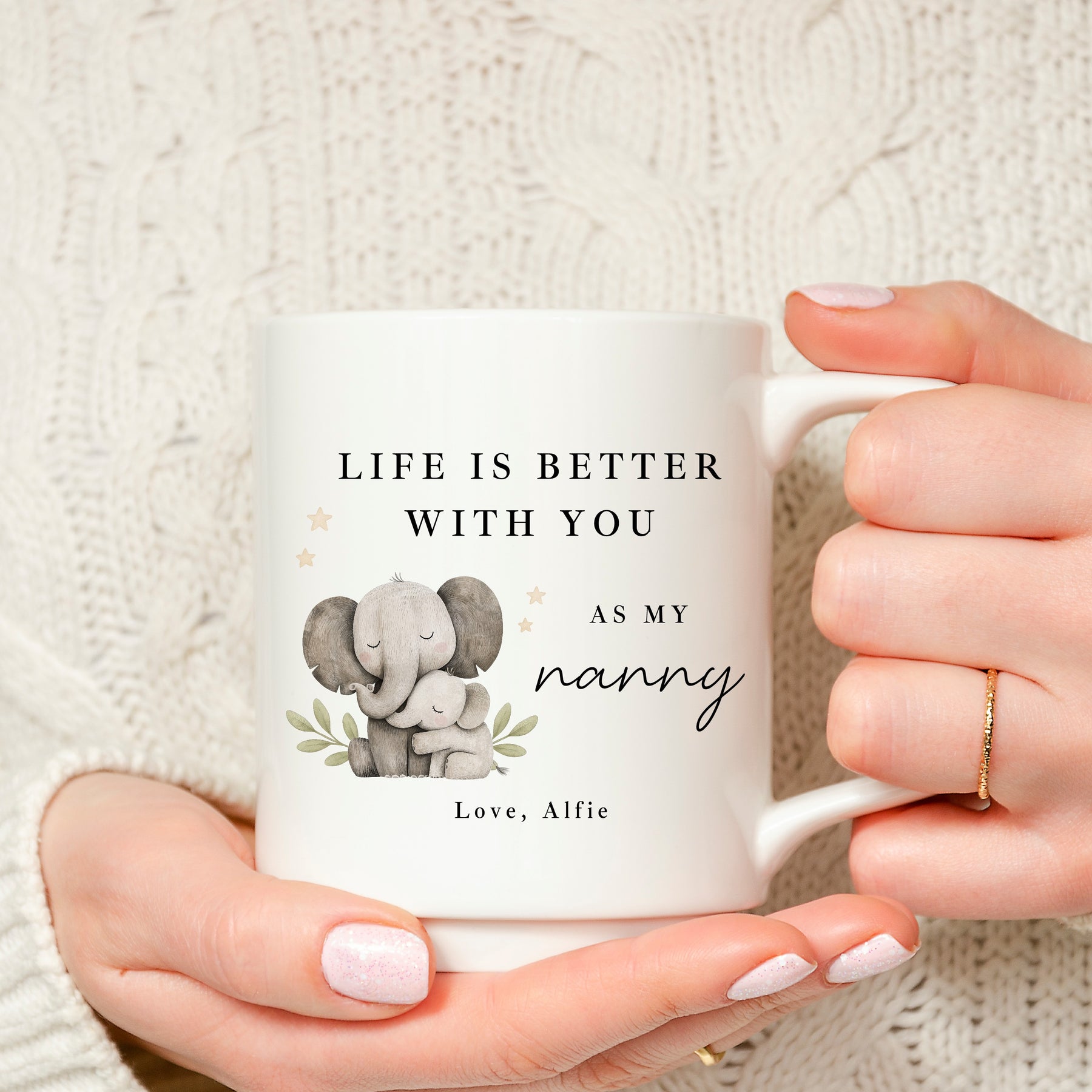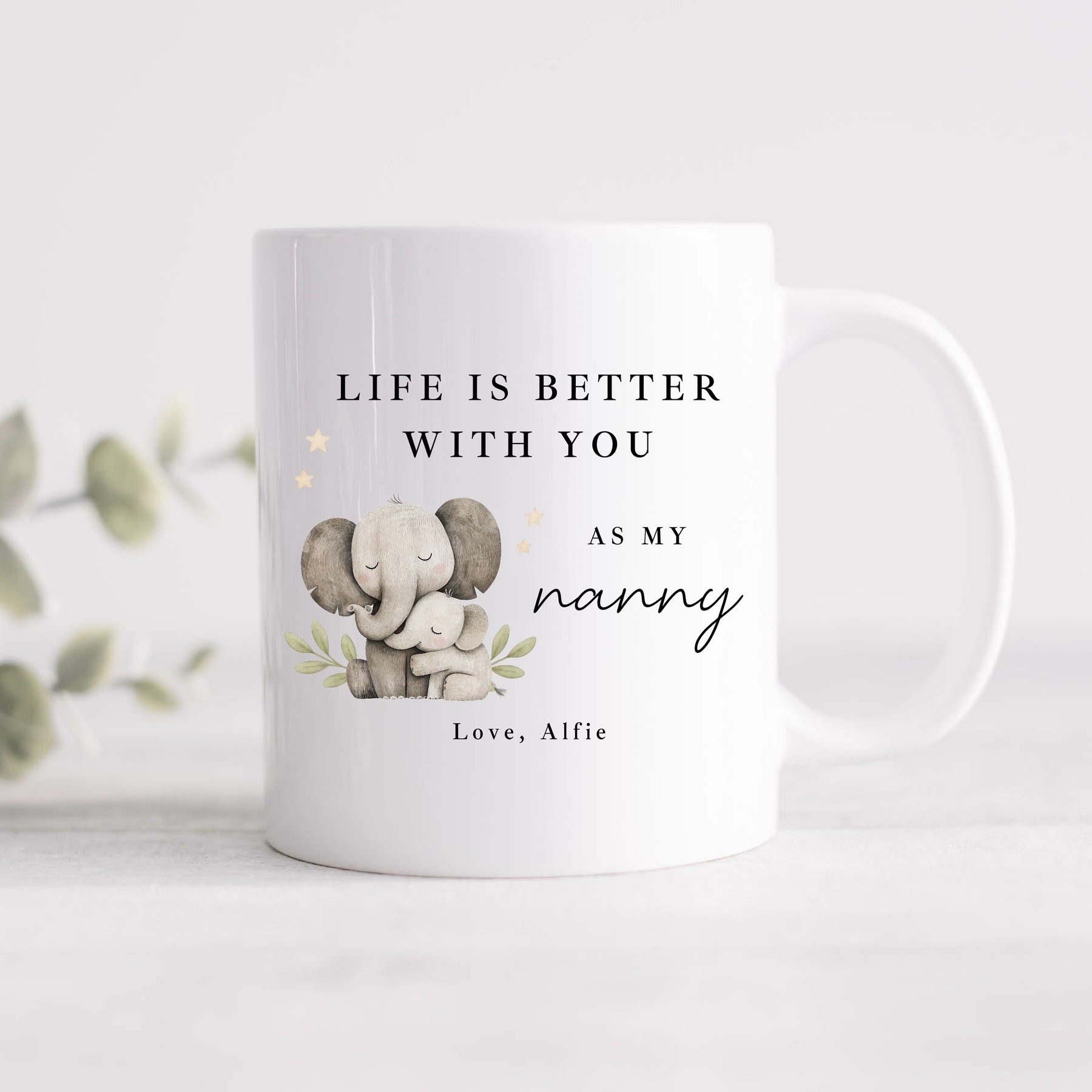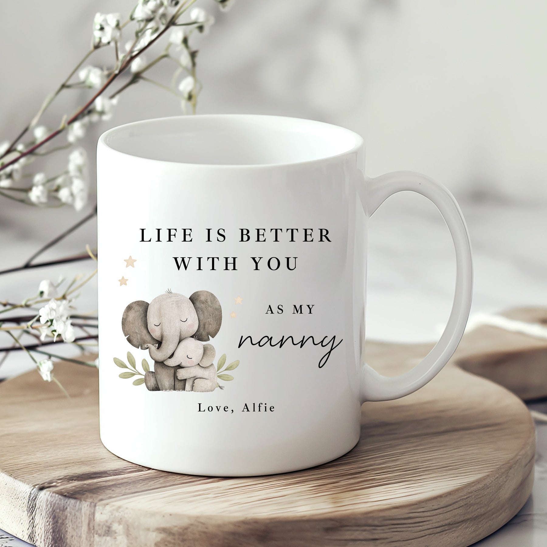 Let Nanny know just how much she means with this beautiful Nanny mug gift, featuring the heartfelt message “Life is better with you as my nanny.” Finished with a sweet illustrated elephant design and personalised with a child’s name, this mug is a meaningful reminder of the love and comfort nanny brings every day.
