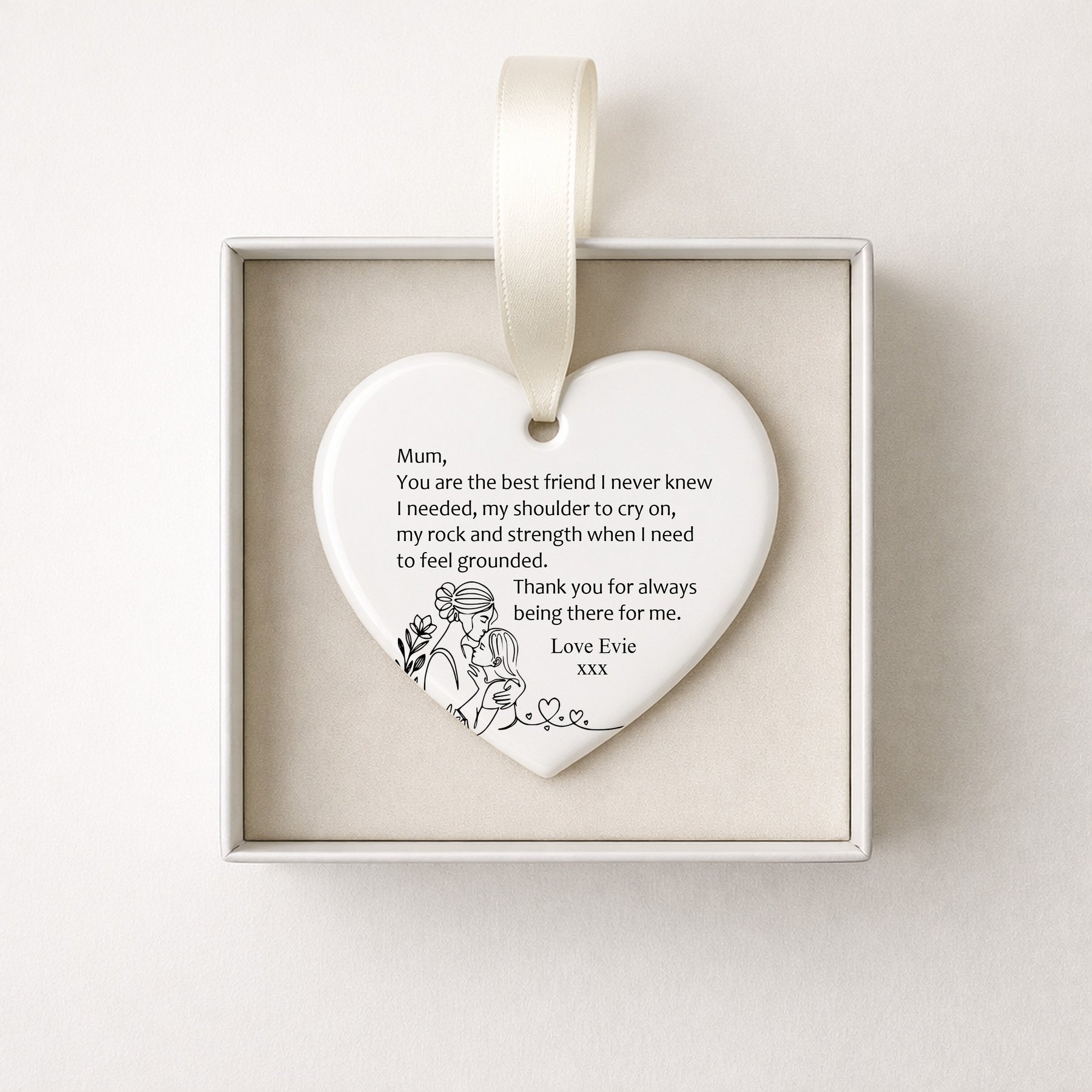 This personalised ceramic heart ornament features a heartfelt message celebrating the strength, comfort, and unconditional love of a mum. With the wording “You are the best friend I never knew I needed…” and a delicate mother-and-child line illustration, it makes a deeply meaningful Mum keepsake for Mother’s Day, birthdays, or simply to say thank you.