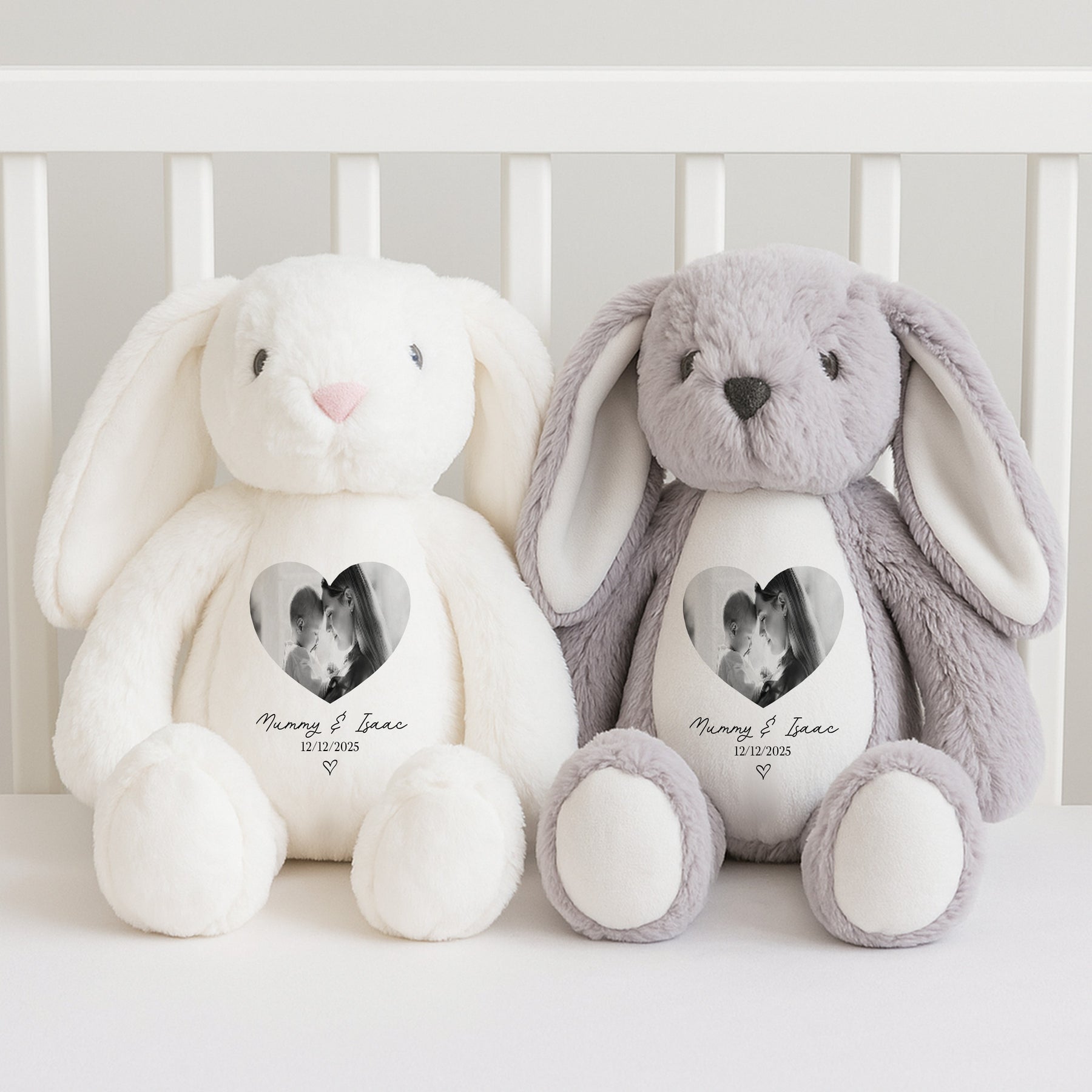 Each soft toy measures approximately 23cm and is professionally sublimated to ensure a smooth, long-lasting finish that won’t crack or peel. Available as a bunny or teddy, you can choose from beautiful neutral and pastel colours including pink, blue, white, grey, or beige, making it suitable for any nursery or home décor. The photo is printed directly onto the fabric for a soft, seamless look.