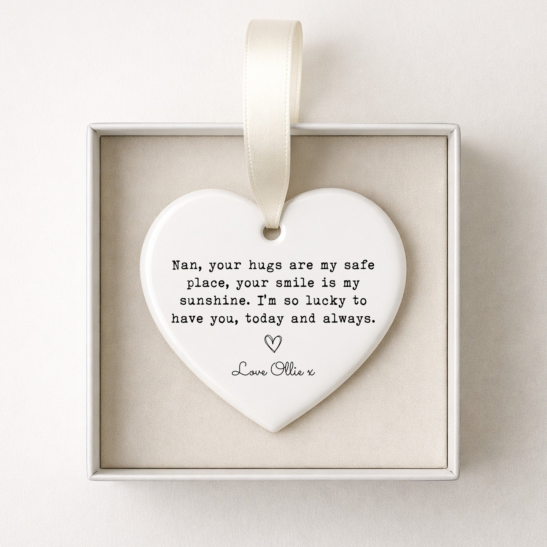 Available as the ornament alone or presented in a white or grey gift box, this keepsake is ideal for those searching for a personalised Nan gift, grandma keepsake, or a sentimental Mother’s Day gift from grandchild. A timeless reminder of love, today and always.
