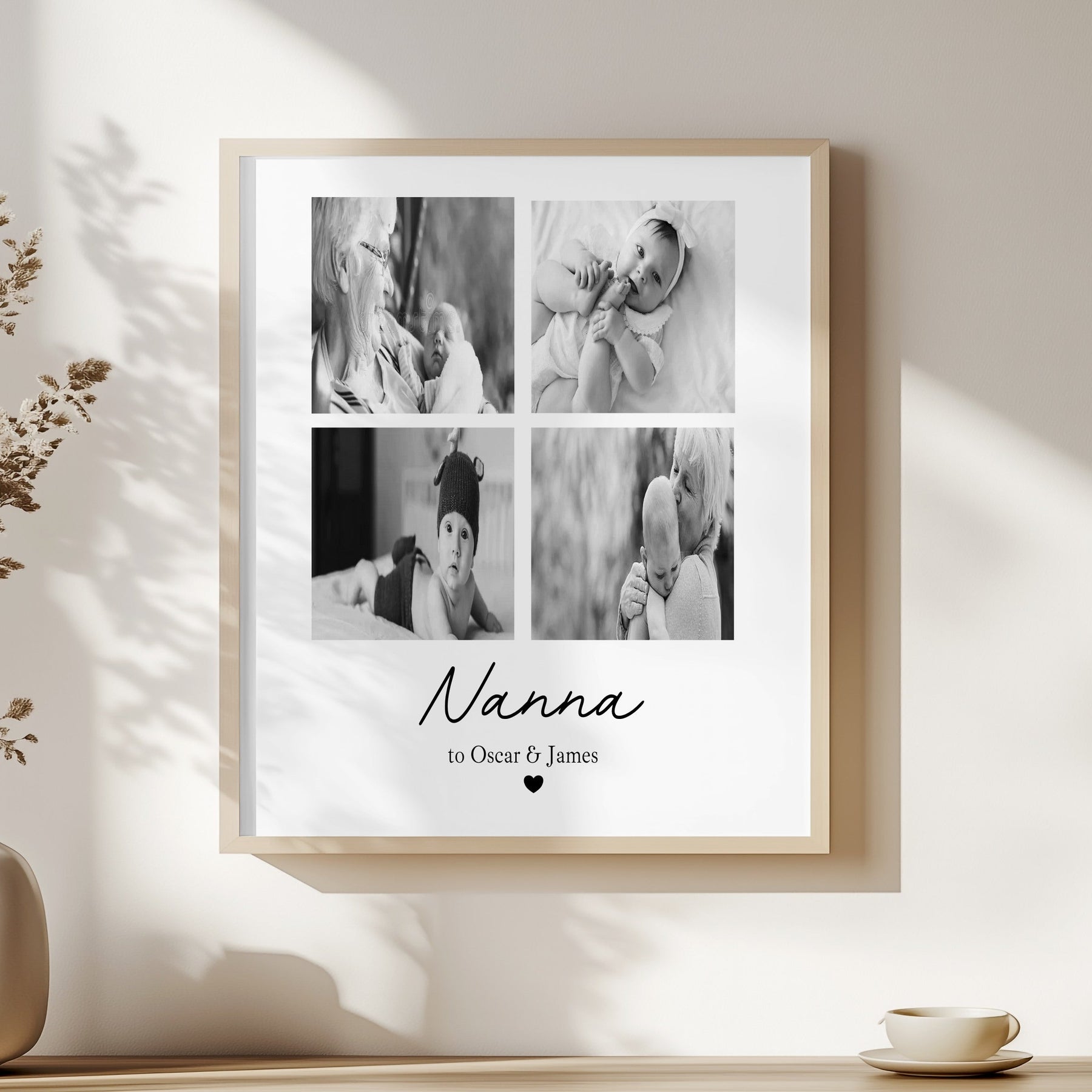 This personalised Nana photo wall print is a beautiful Mother’s Day gift for Nana, celebrating the special bond between a grandmother and her grandchildren. Featuring four of your favourite photos arranged in a clean grid layout with custom names, this design is created as a heartfelt Nana keepsake gift from baby or child that captures precious family moments.