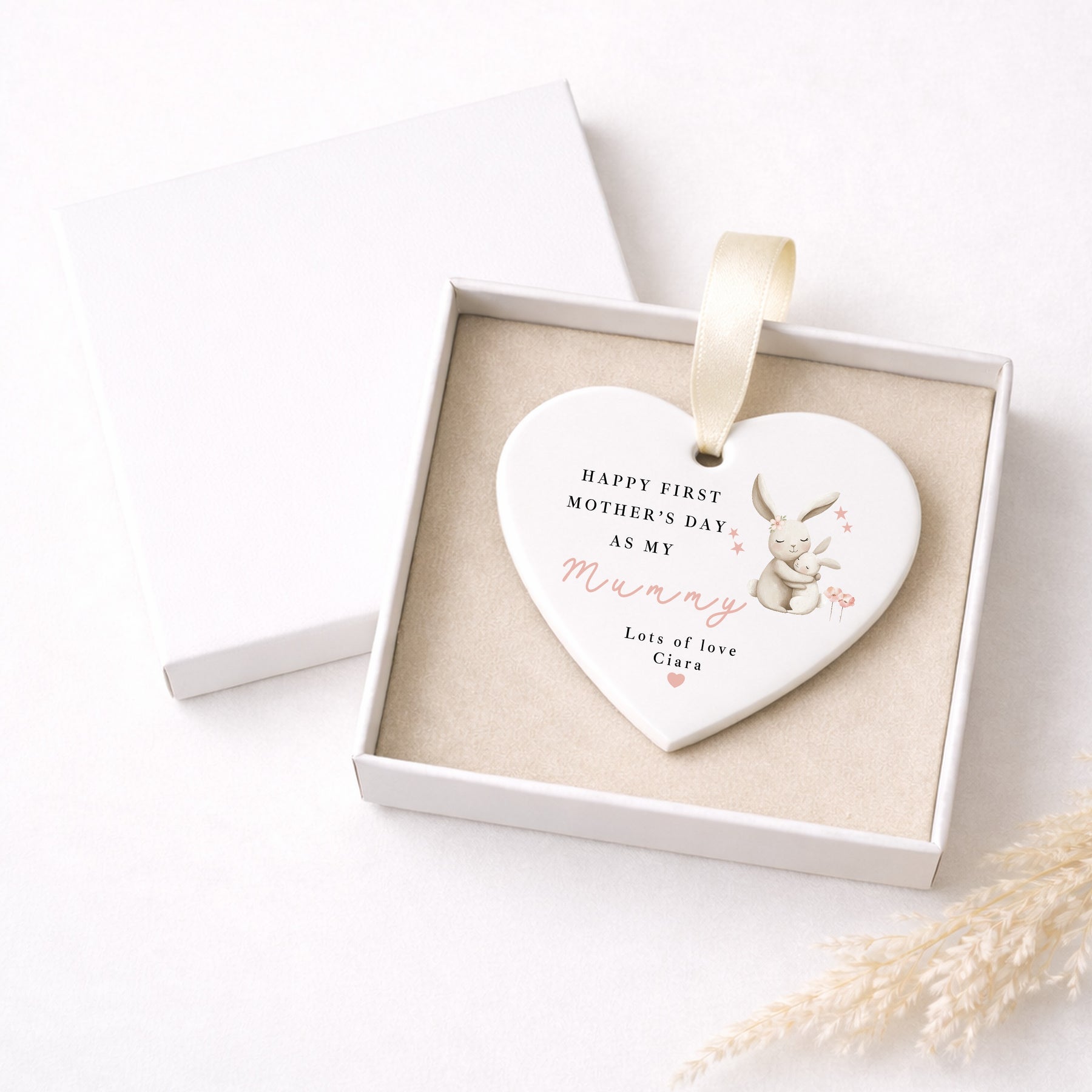 This personalised ceramic heart ornament is designed to celebrate a first Mother’s Day, featuring the message “Happy First Mother’s Day as my mummy” alongside a soft mummy and baby bunny illustration. Finished with a personalised name, it makes a thoughtful new mum gift and a keepsake to mark this special milestone.