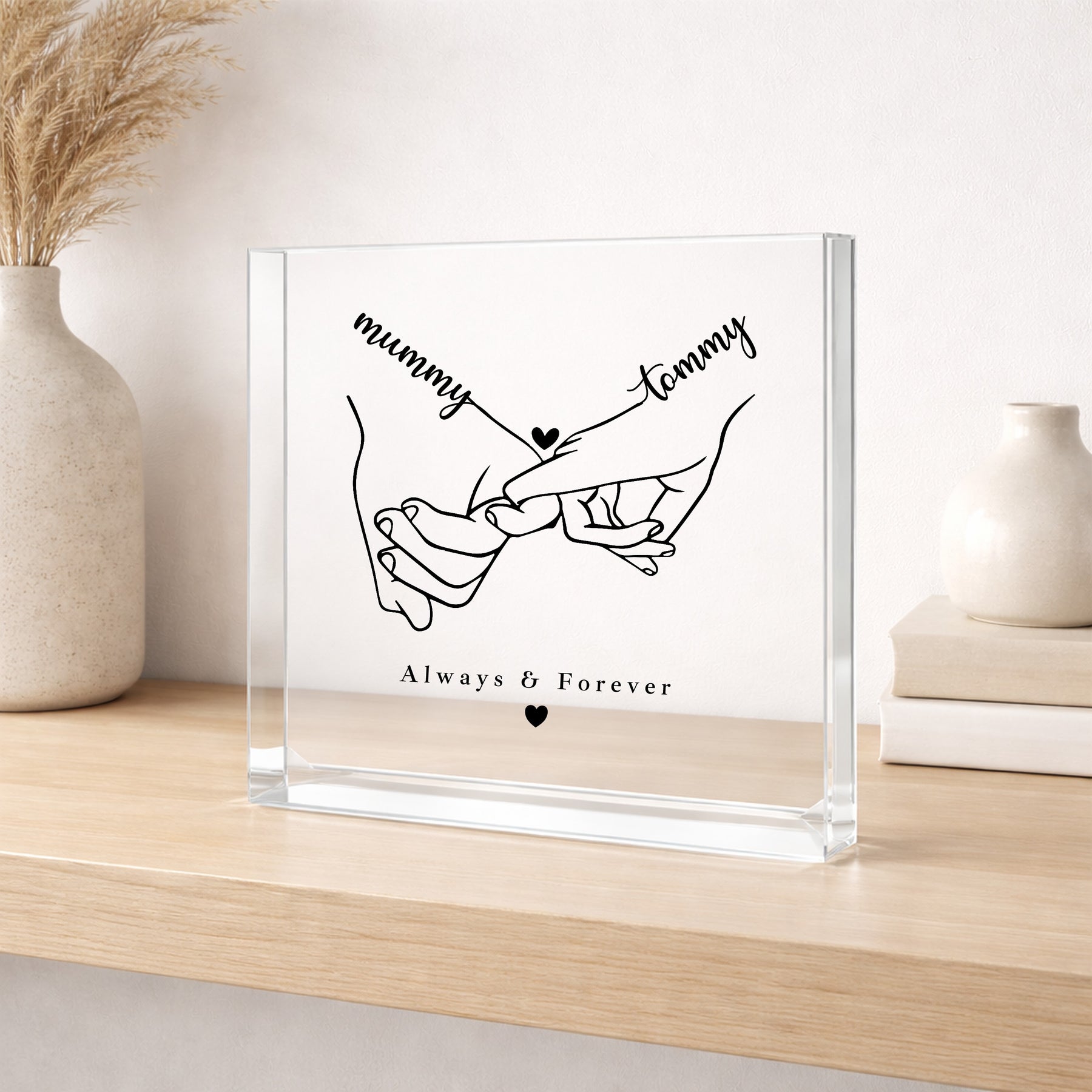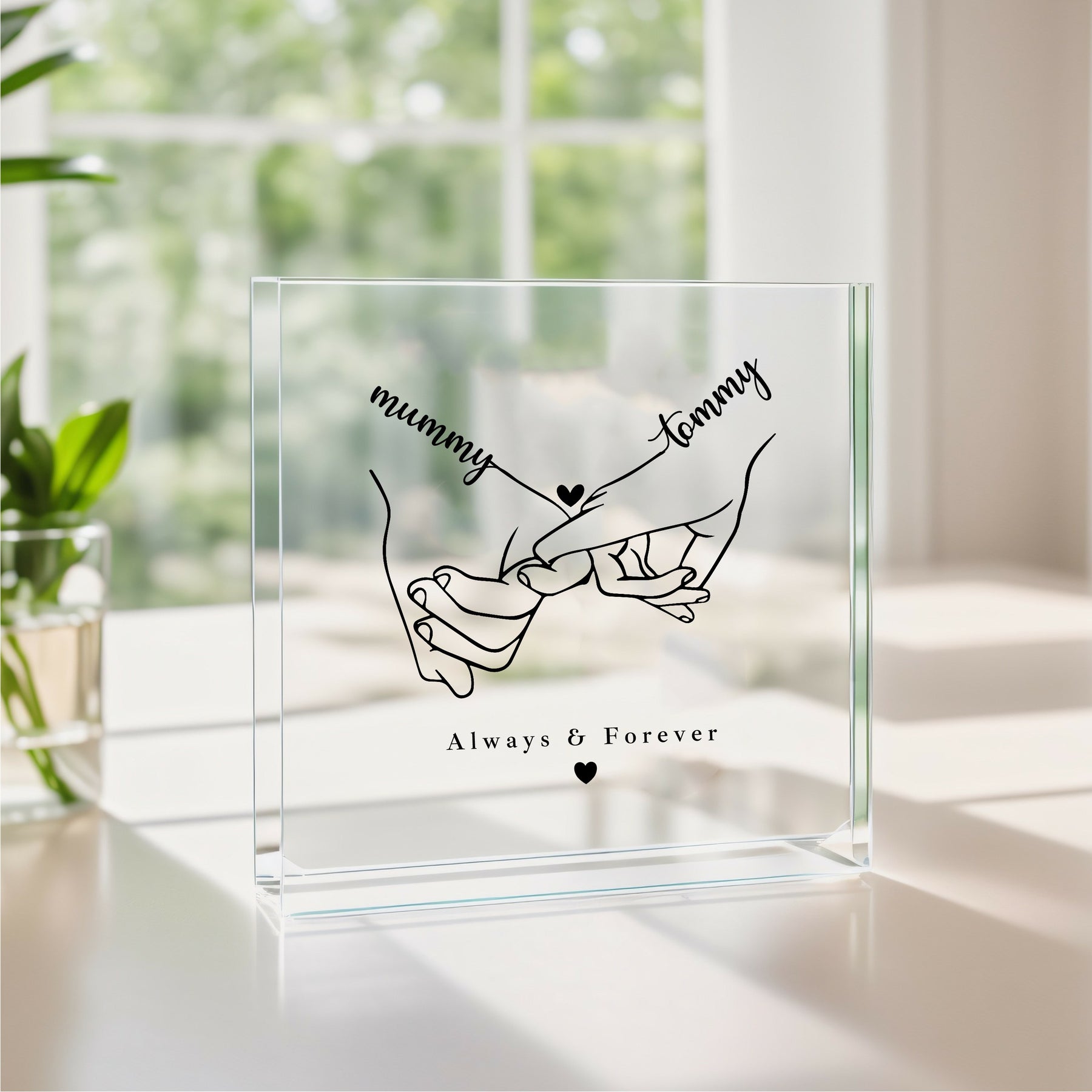 This personalised Mummy gift is a meaningful UV acrylic block keepsake featuring a delicate line art illustration of a parent and child holding hands, personalised with names and the phrase “Always & Forever”. Designed for mums, this clear acrylic block makes a heartfelt Mother’s Day gift for Mummy or a sentimental keepsake for any time of year.