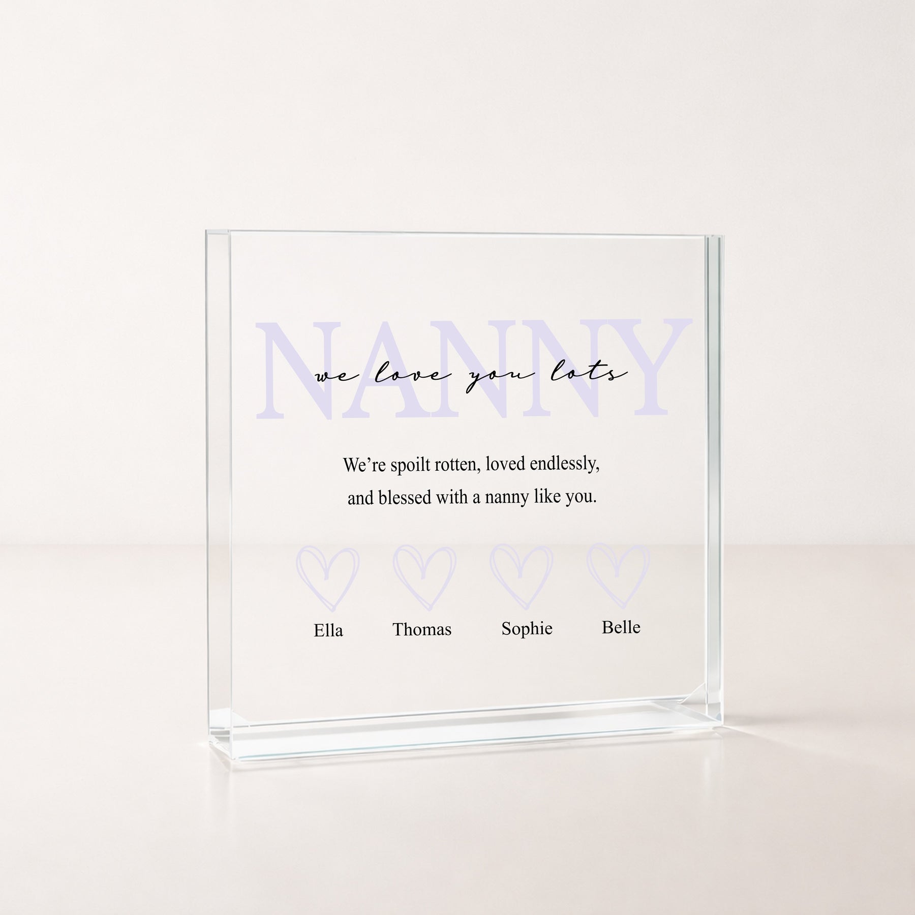 This personalised Nanny Mother’s Day gift is a heartfelt UV acrylic block keepsake featuring the message “Nanny we love you lots” with personalised children’s names. Designed especially for nannies, this clear acrylic block makes a meaningful Mother’s Day gift for Nanny from grandchildren.