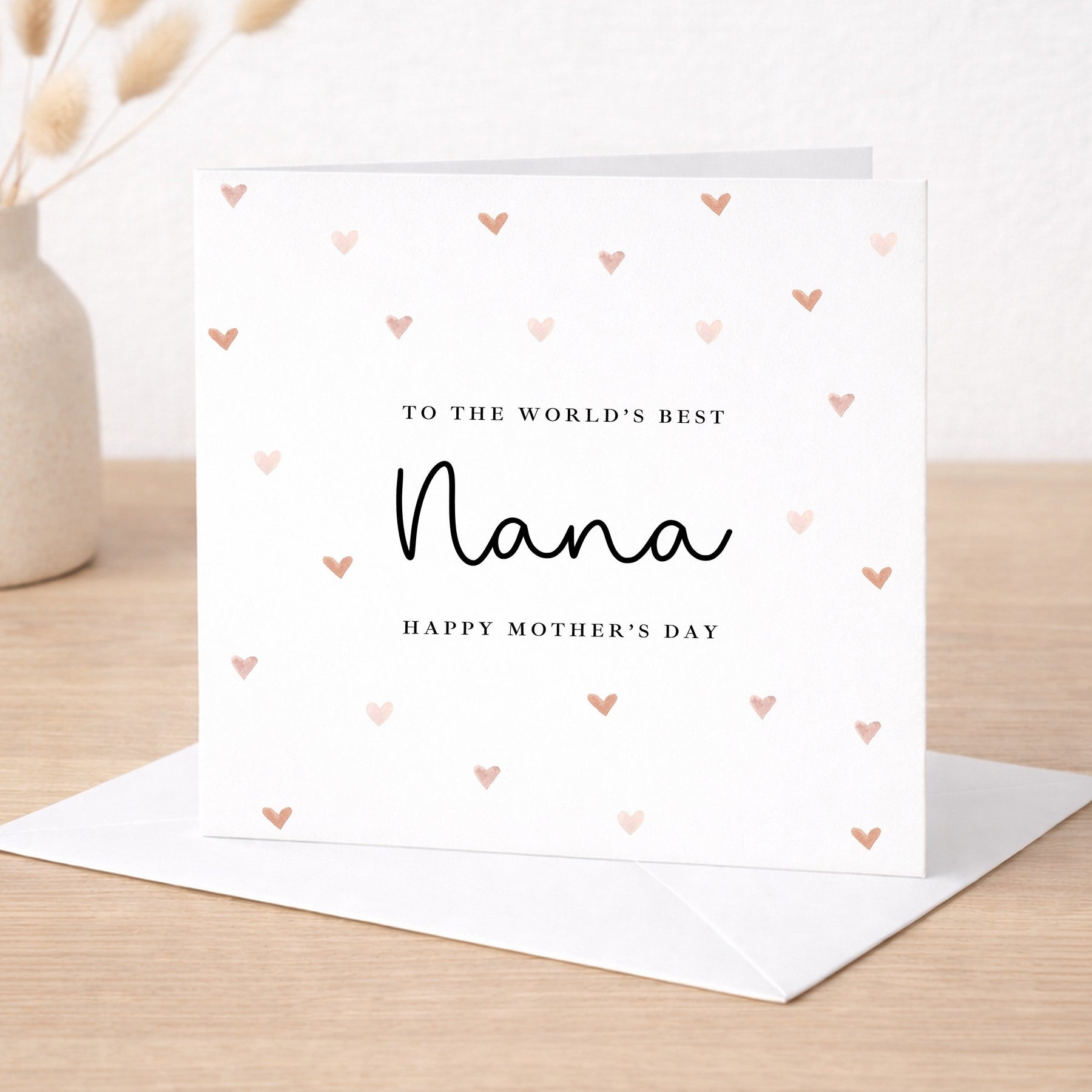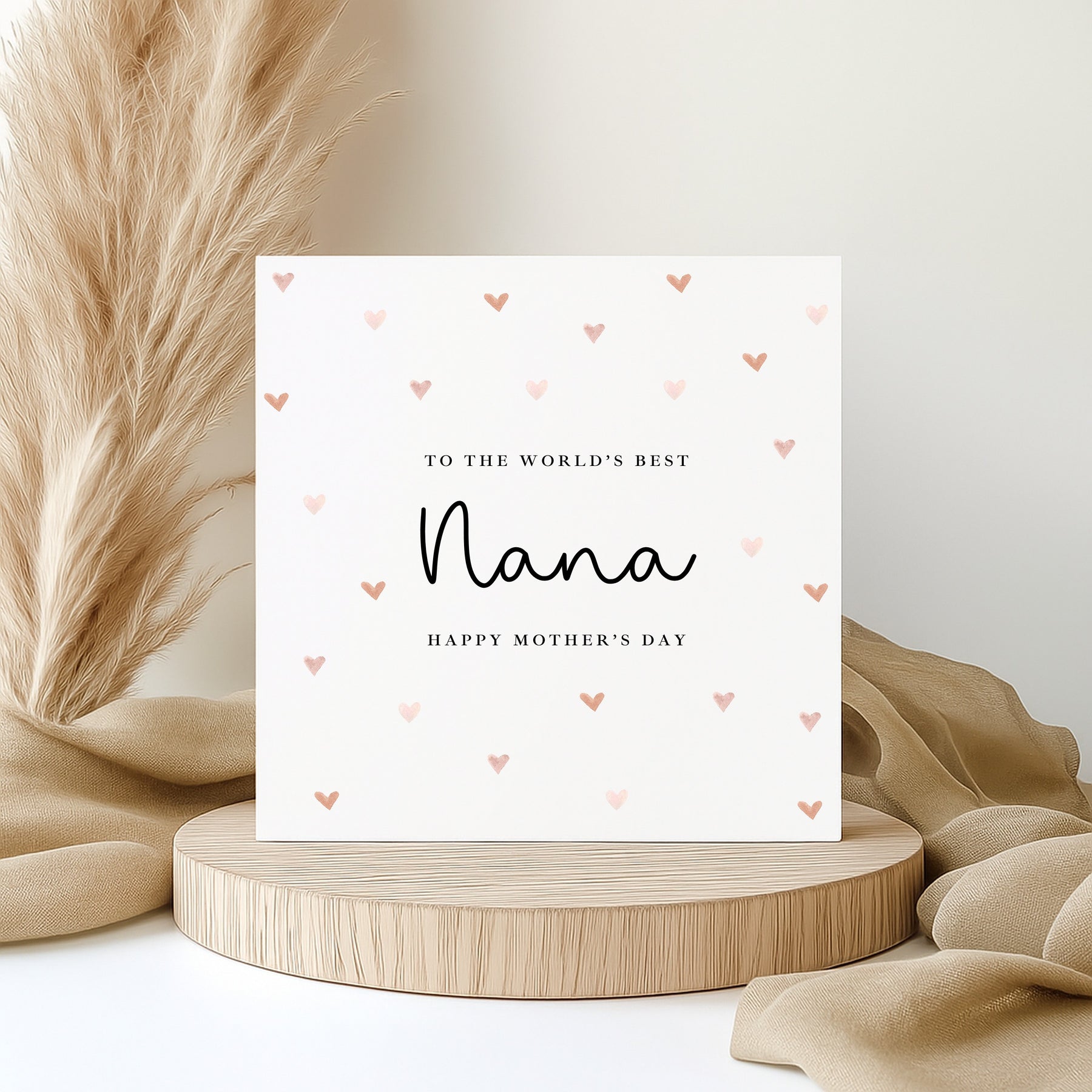 This Mother’s Day card for Nana features the message “To the world’s best Nana” with a soft heart pattern, making it a meaningful world’s best nana Mother’s Day card. Designed as a card for Nana Nan Grandma, this classic style is perfect for showing love and appreciation on Mother’s Day.