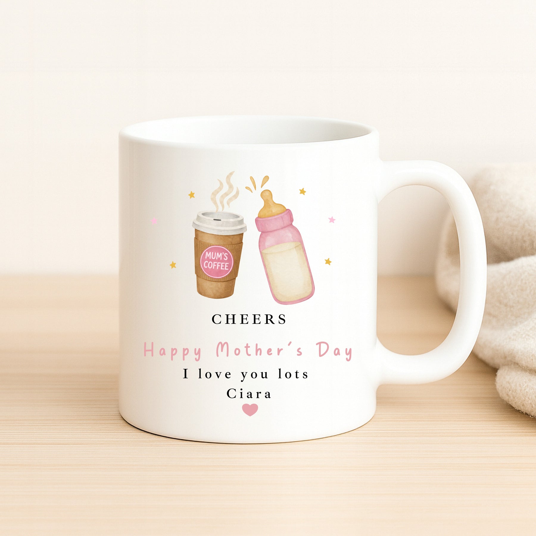 This personalised Mother’s Day mug features a charming coffee cup and baby bottle illustration with the message “Cheers – Happy Mother’s Day”, finished with a personalised name sign-off. Designed as a fun and heartfelt keepsake, it’s a lovely Mother’s Day gift for mummy, perfect from a child, toddler or baby.