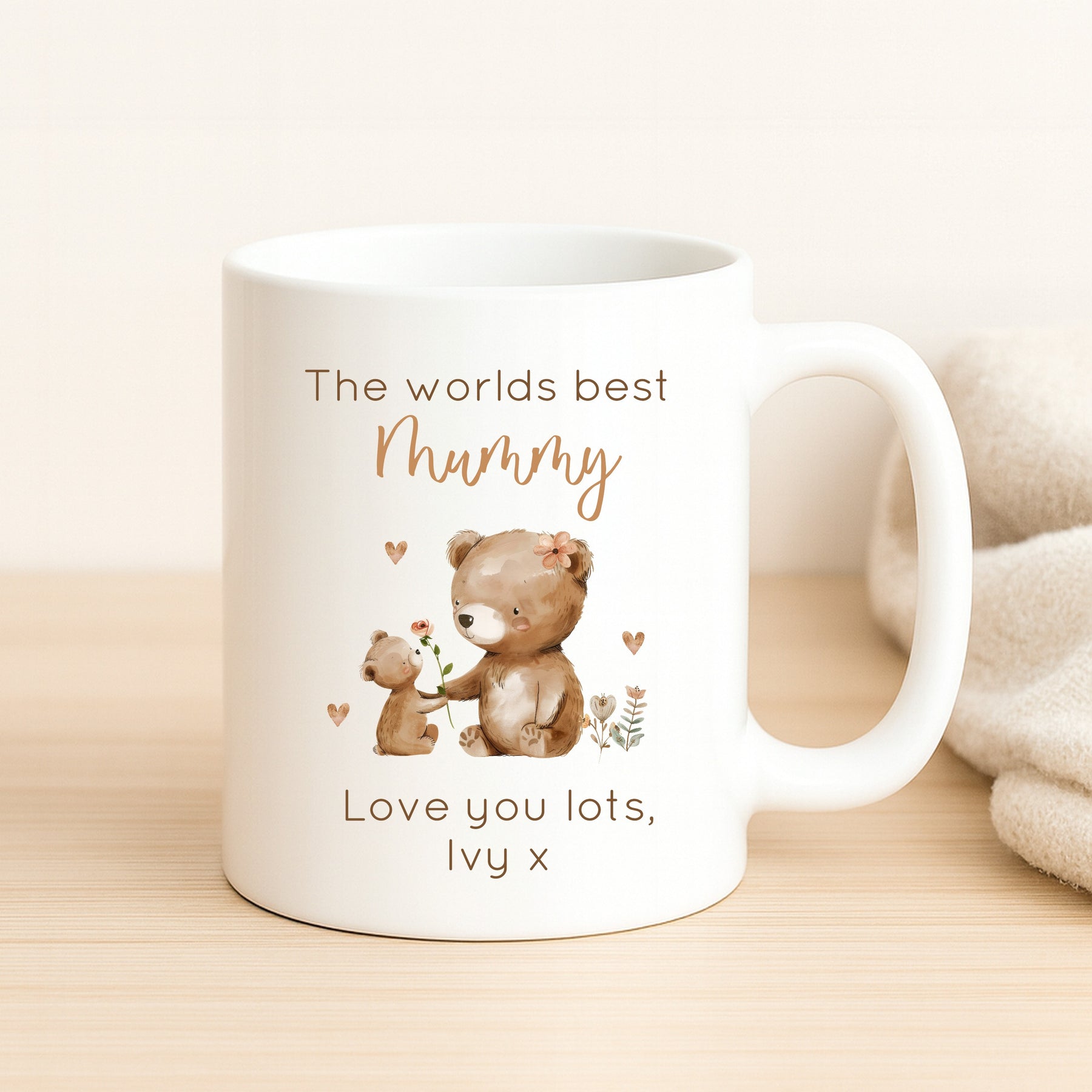 This personalised Mother’s Day mug is a heartfelt gift made just for Mum. Featuring a sweet teddy bear illustration and the message “The world’s best mummy”, it’s finished with a personalised name sign-off, making it a truly special keepsake. A perfect Mother’s Day gift for mum, whether from a child, baby, or little one.