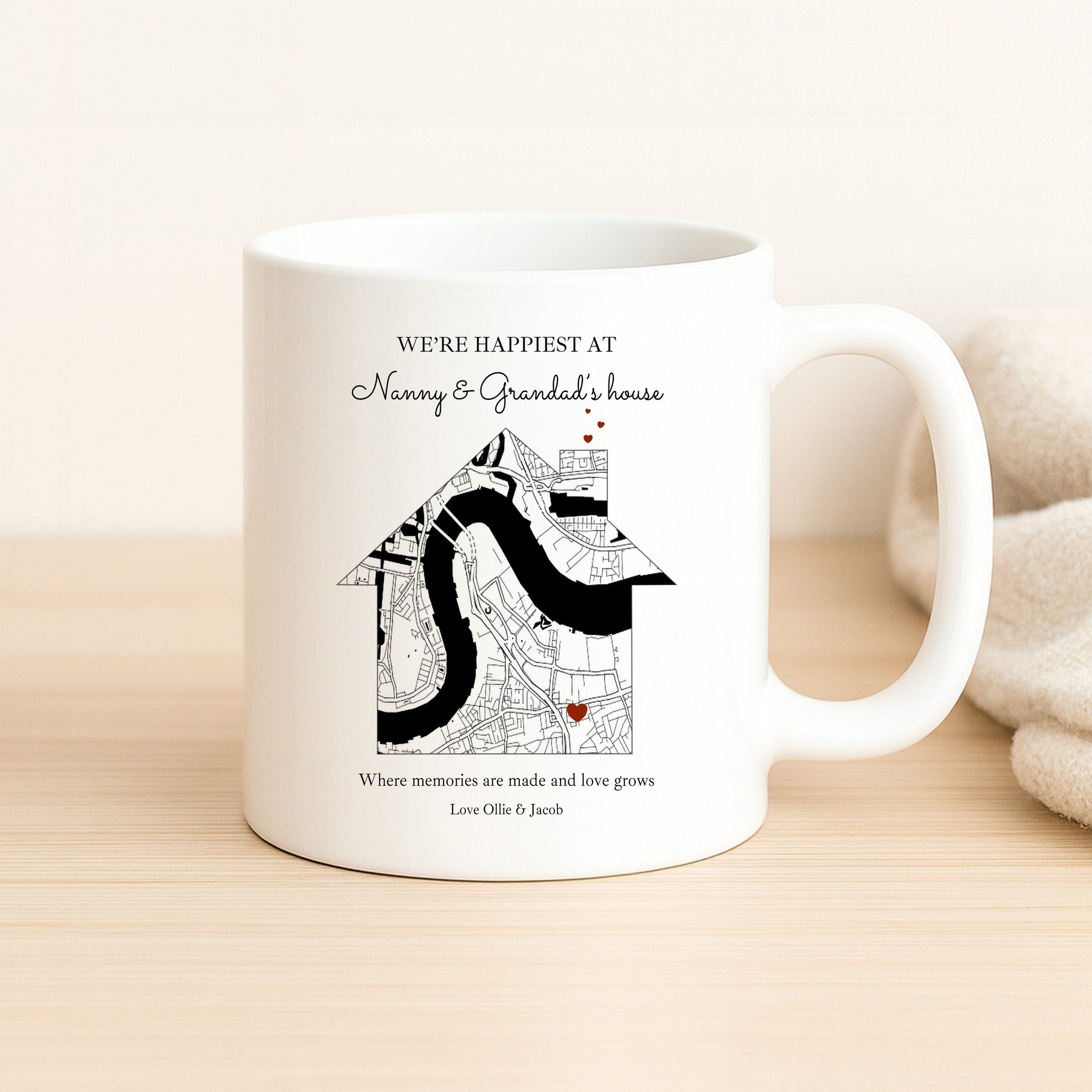 Celebrate the place where memories are made with this meaningful Nanny and Grandad mug gift, featuring the touching message “We’re happiest at Nanny & Grandad’s house.” Designed with a charming house illustration and personalised with children’s names, this mug is a beautiful reminder of love, warmth, and family time spent together.