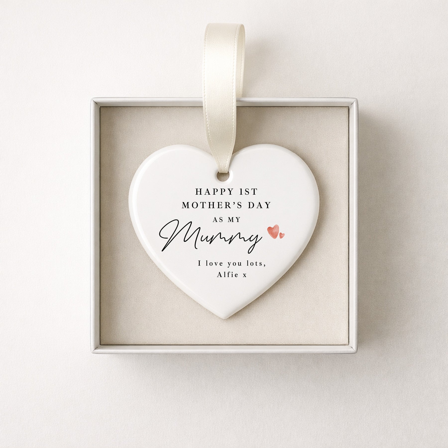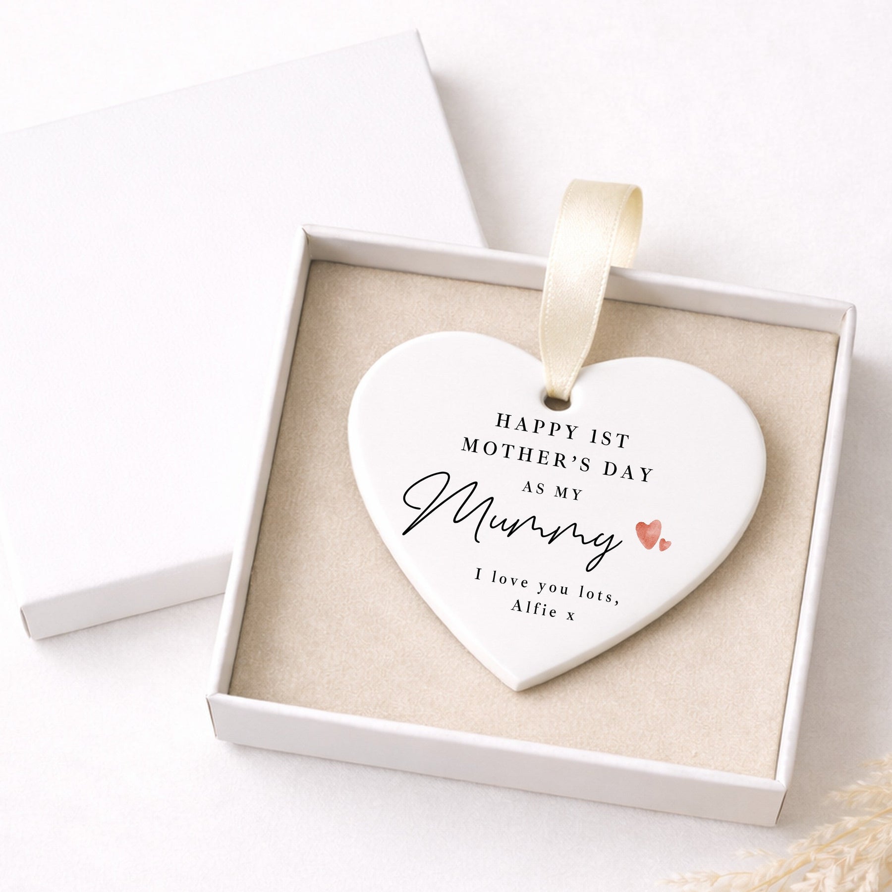 Made from smooth white ceramic, the heart measures 7cm and is professionally UV printed for a clear, long-lasting finish. Each ornament comes complete with a ribbon, ready to hang and display as a reminder of a first Mother’s Day.