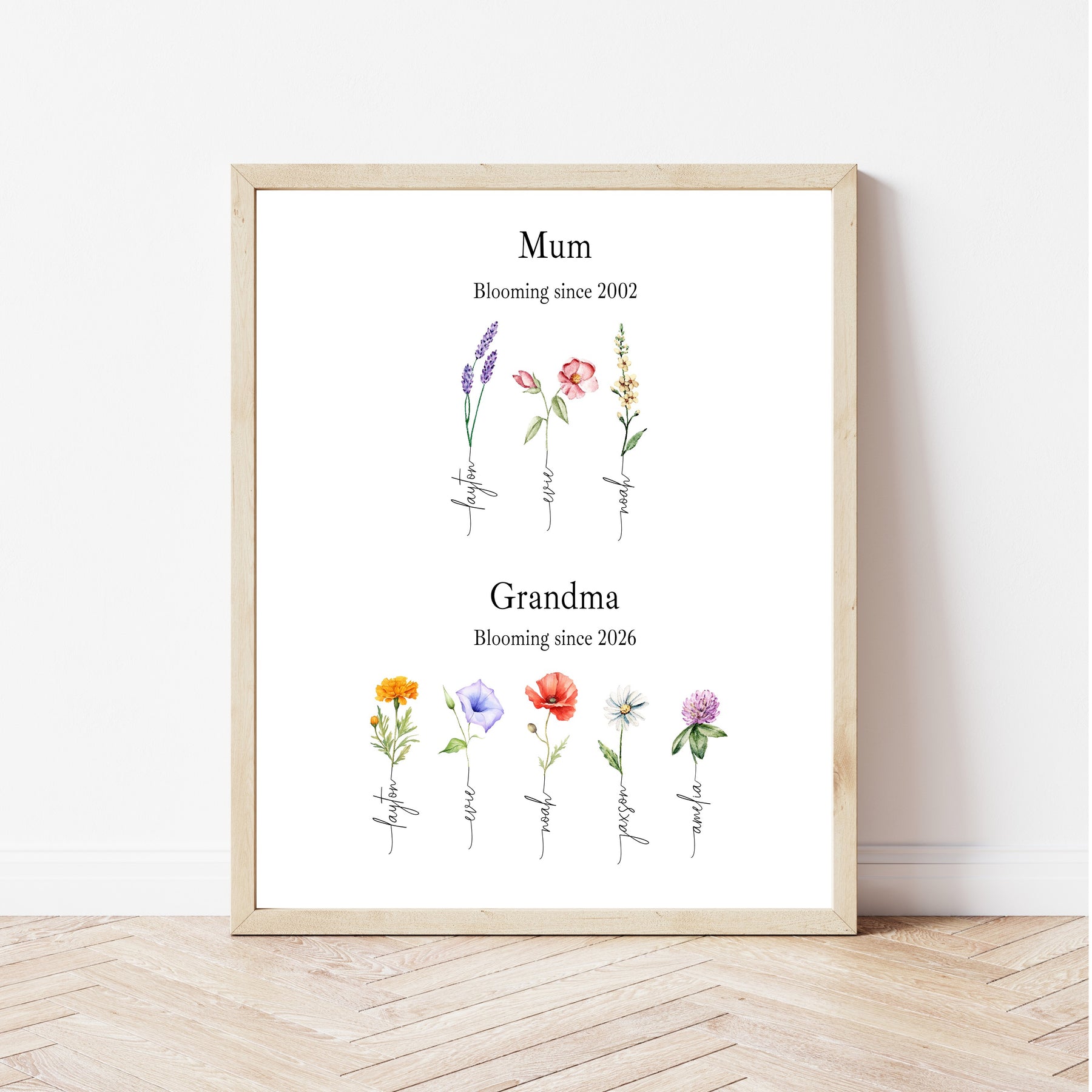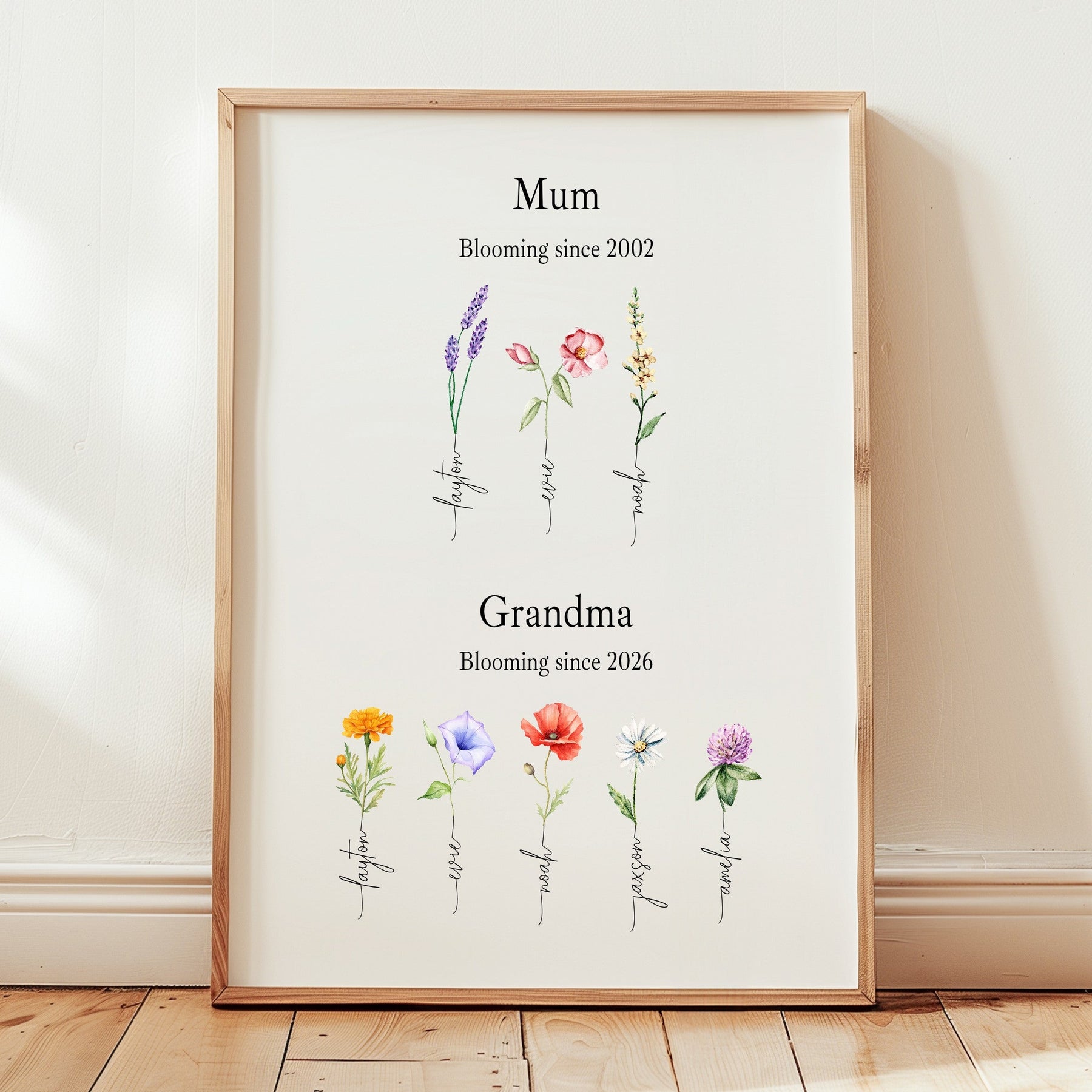 This personalised grandma's garden wall print is a meaningful Mother’s Day gift for Nanny, Nana, or Nannie, celebrating the special date she became a grandmother. Featuring all of her grandchildren's names and birth flowers, this design creates a timeless nanny keepsake gift she’ll treasure forever. A thoughtful gift from a baby or grandchild, perfect for sentimental family moments.