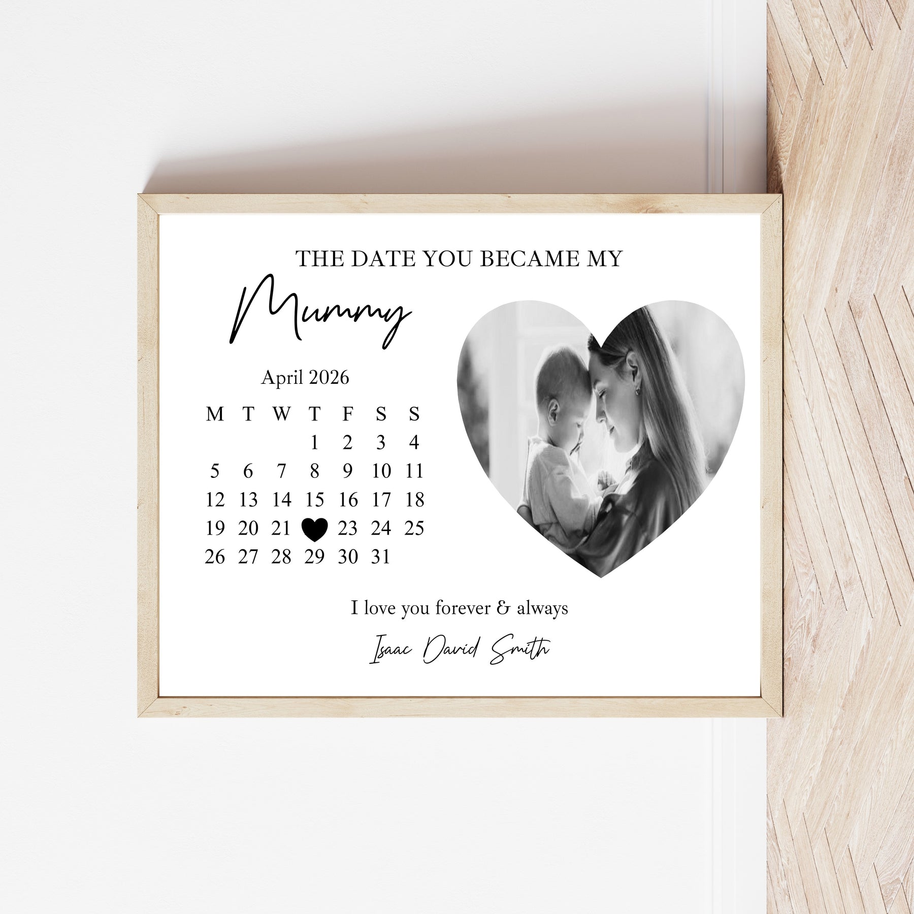 Ideal as a Mother’s Day gift from a baby, child, or children, this custom print makes a thoughtful present for new mums, first-time mums, or a sentimental surprise “from bump.” Simply provide your photo, name, and special date to create a timeless piece of personalised wall art she’ll treasure forever.