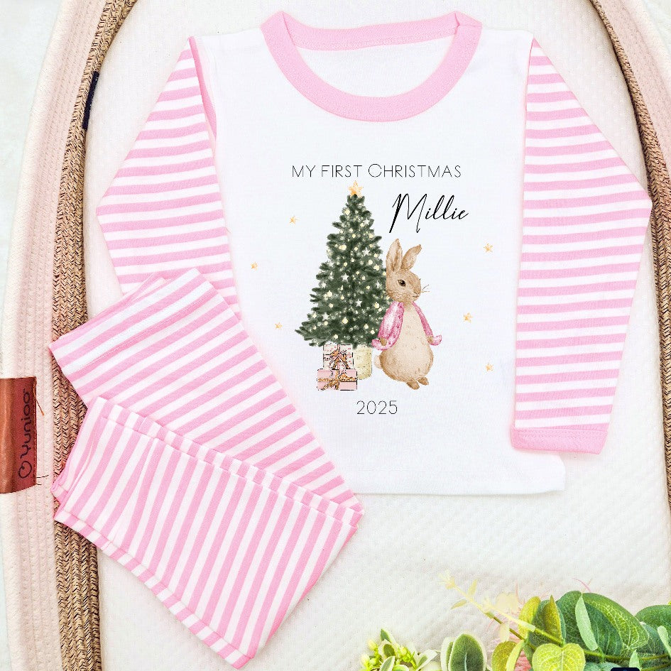 Personalised My First Christmas Pink Rabbit Pink Stripe Pyjamas