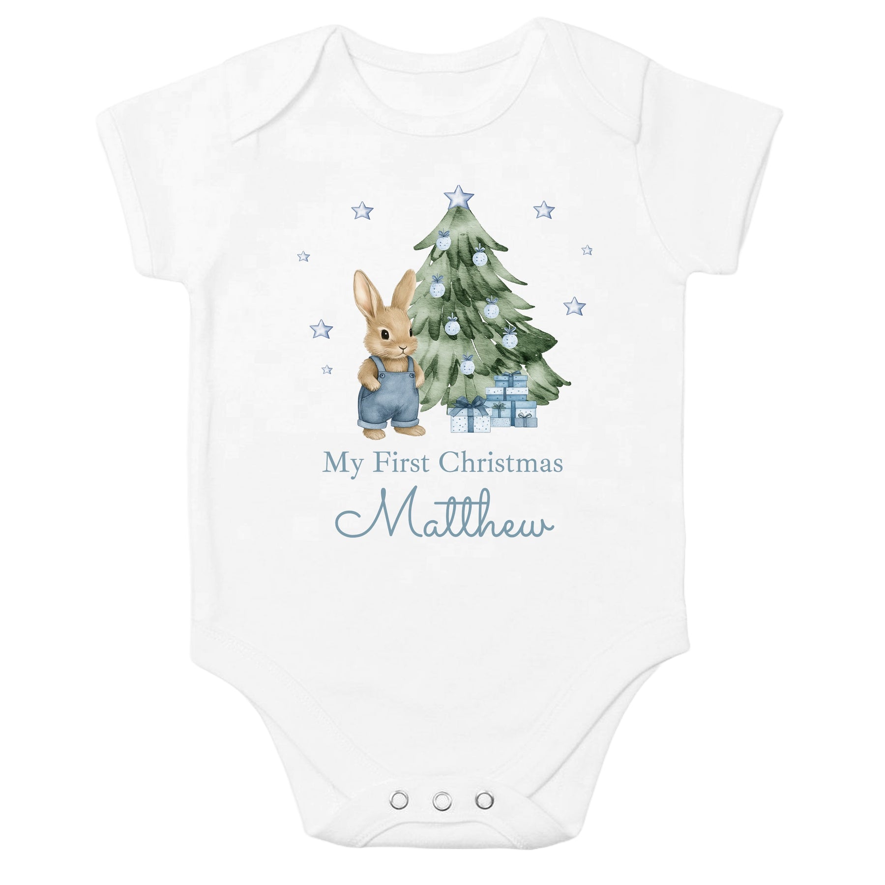 Welcome a precious little one with this beautifully coordinated personalised “My First Christmas” baby gift set, featuring a digitally printed white vest and matching blanket adorned with a charming blue bunny and Christmas tree design. Each piece is customised with your chosen baby name, creating a truly magical keepsake perfect for celebrating a baby girl’s first festive season.