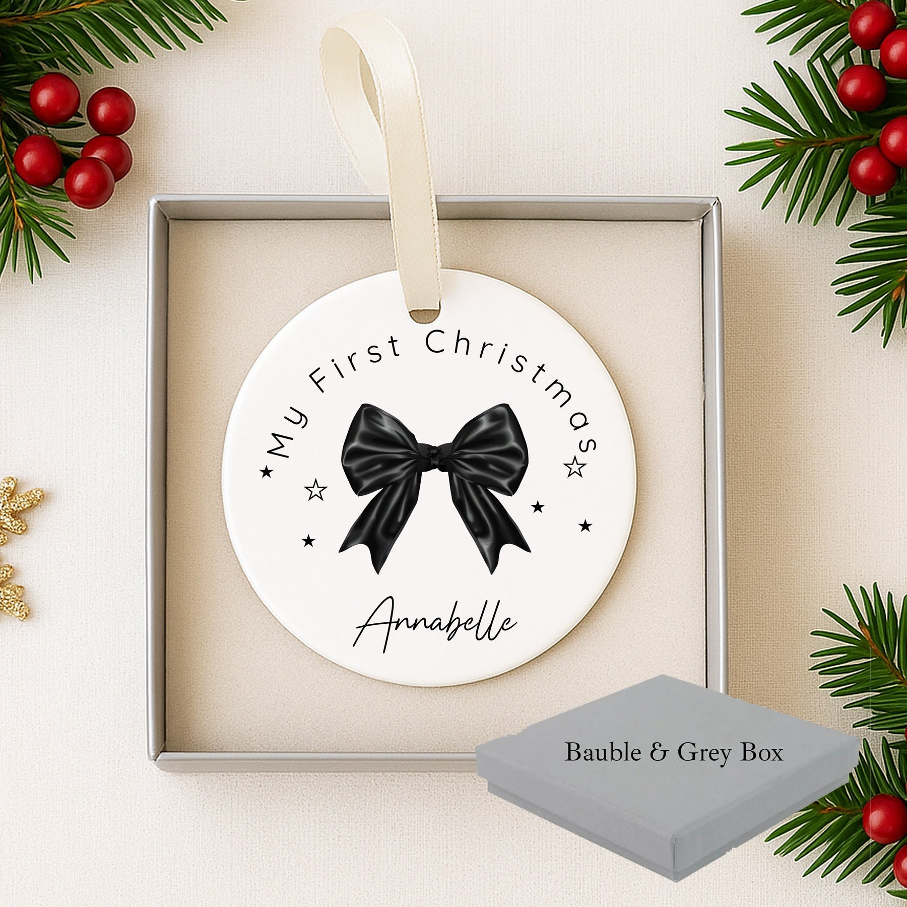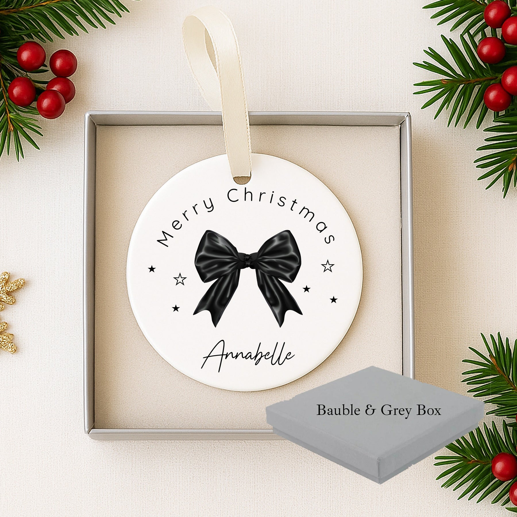 Add a unique touch to your holiday decorations with this Personalised Black Bow Christmas Bauble. Featuring a sleek black bow, this bauble can be customized to celebrate your loved ones or special moments. Its elegant design complements any Christmas tree style, creating a warm and festive atmosphere that brings family and friends closer during the season. Perfect for gifting or keeping as a cherished keepsake year after year.