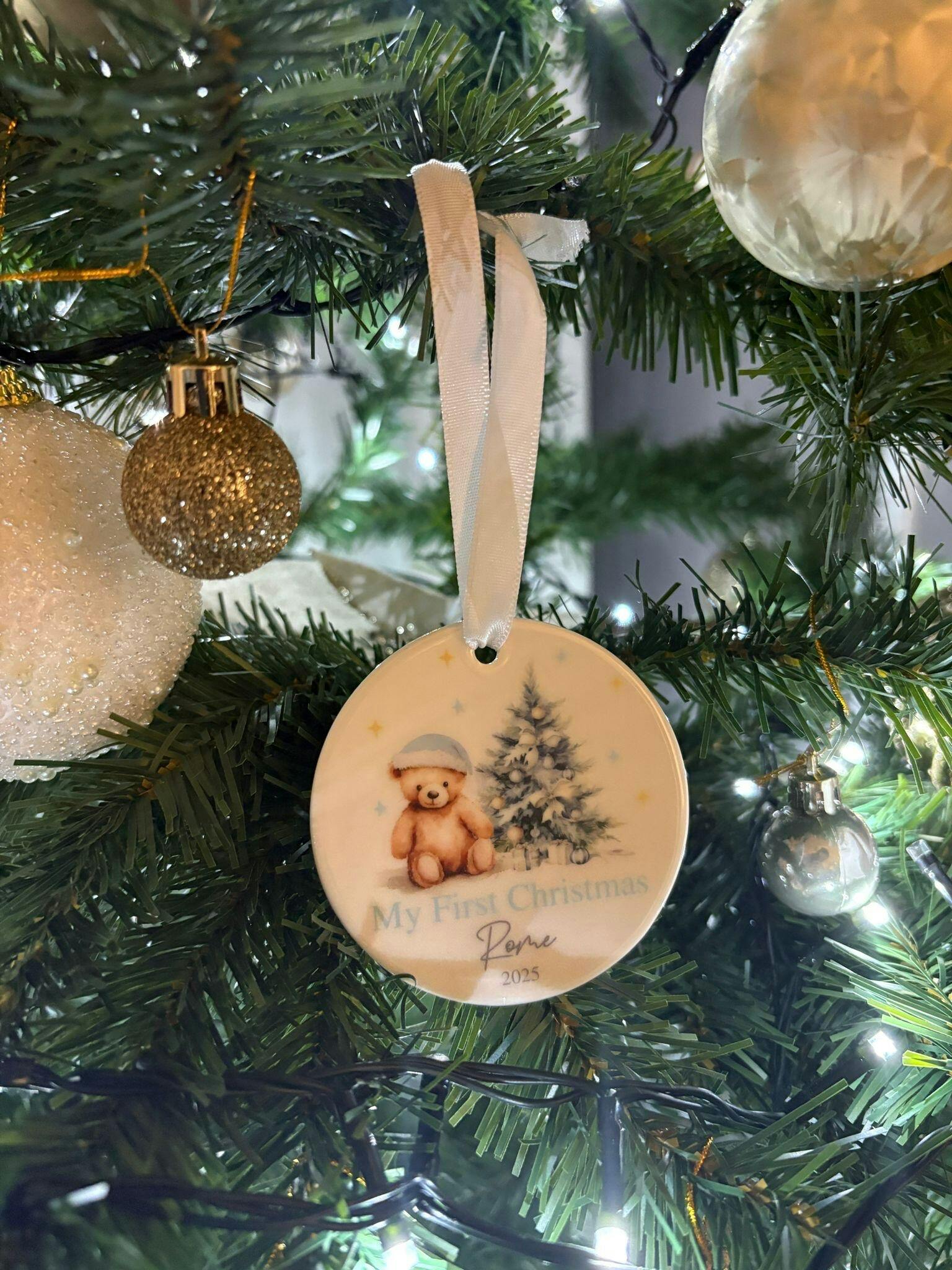 Personalised My First Christmas Blue Teddy Ceramic Ornament