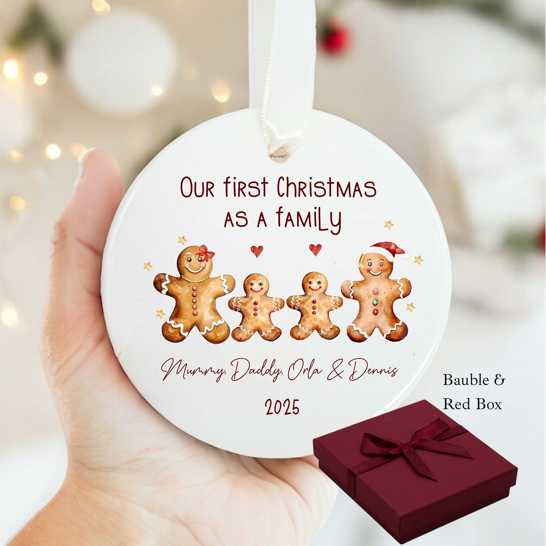Celebrate your family’s first Christmas together with the Personalised Our First Family Gingerbread Christmas Bauble. Customised with your family name, this charming bauble features a festive gingerbread design, making it a heartfelt keepsake to hang on your tree. It’s a special way to mark this milestone and create lasting holiday memories.