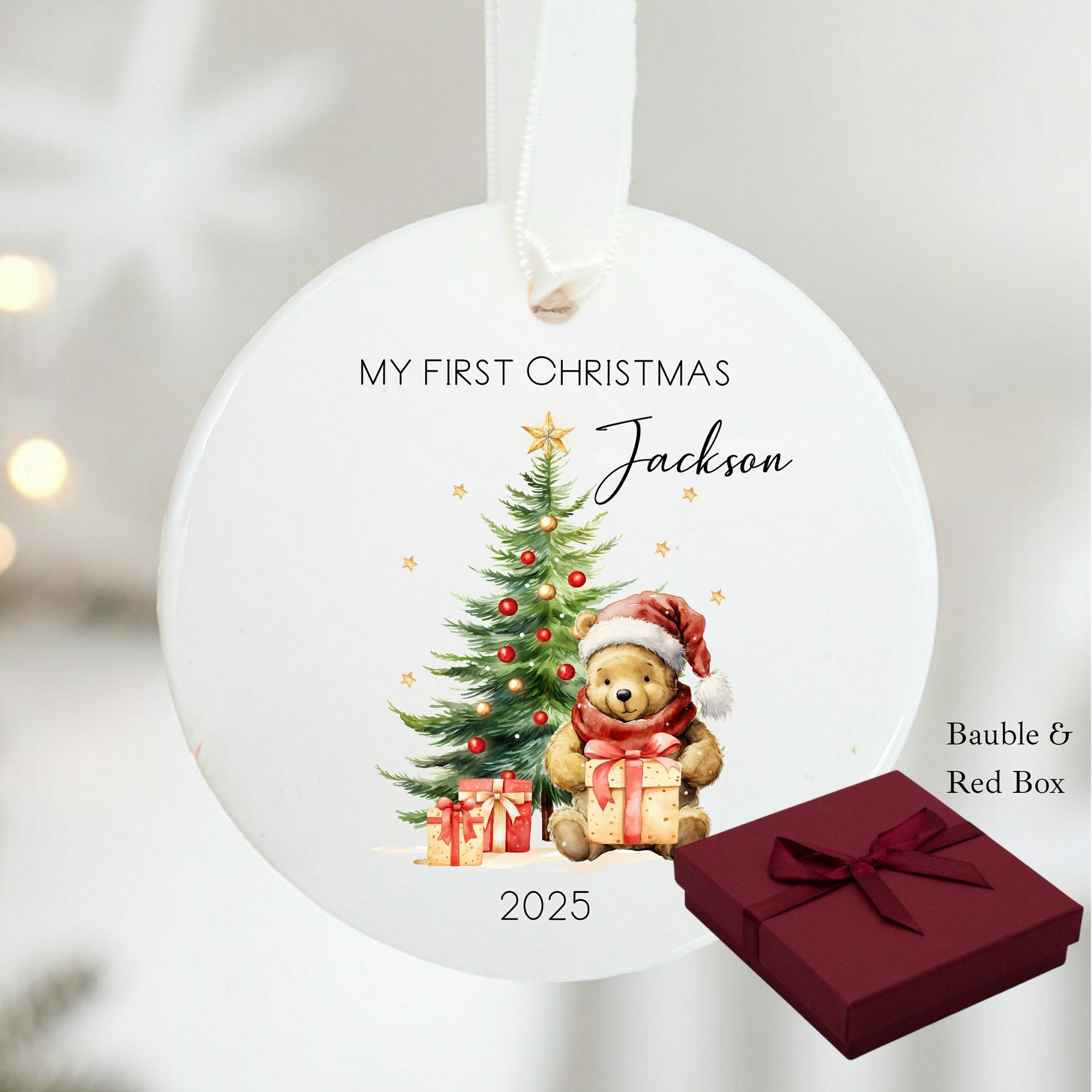 Celebrate your little one’s first Christmas with this charming Personalised Pooh Bear Bauble. Featuring a sweet Pooh Bear design, it can be customised with your child’s name to create a treasured keepsake. This bauble adds a heartfelt touch to your festive decorations and becomes a special memory to cherish for years to come. Perfect for welcoming your baby’s first holiday season with warmth and love.