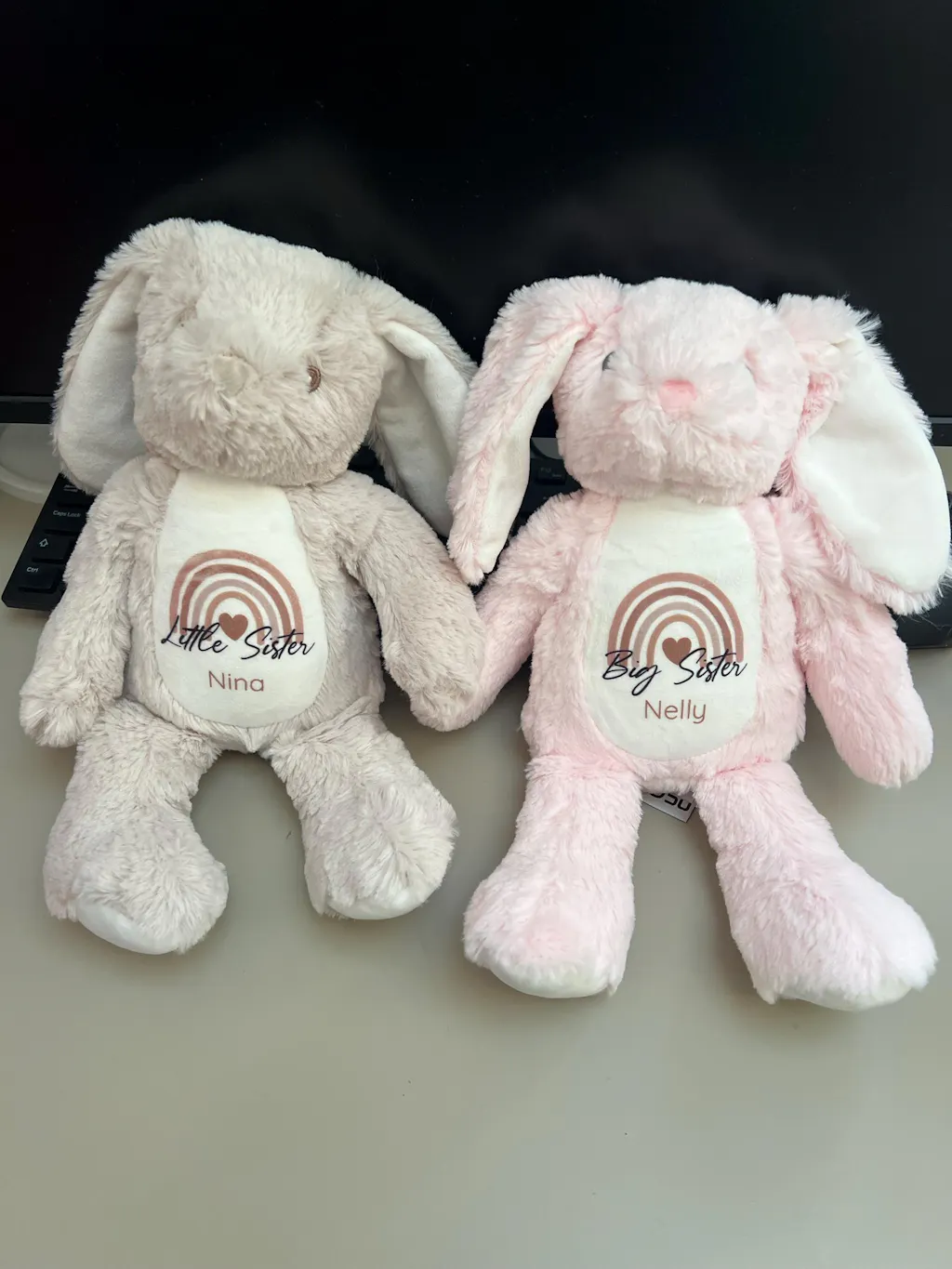 Celebrate the special bond with a personalised beige rainbow teddy, perfect for big sisters or brothers. Choose from five adorable teddy options to create a heartfelt gift that shows love and support during this exciting new chapter. Soft and cuddly, this teddy offers comfort and a personal touch that your little one will cherish.