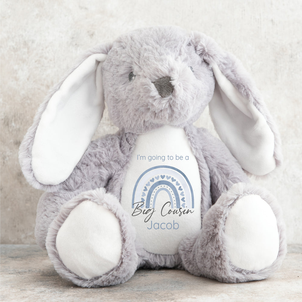 This personalised dusky blue rainbow big cousin teddy is a comforting companion, perfect for showing love and support to a special cousin. Soft and cuddly, it offers warmth and reassurance, making it an ideal gift to celebrate your unique bond. Its gentle hues and personalised touch create a meaningful keepsake that will be treasured for years to come.