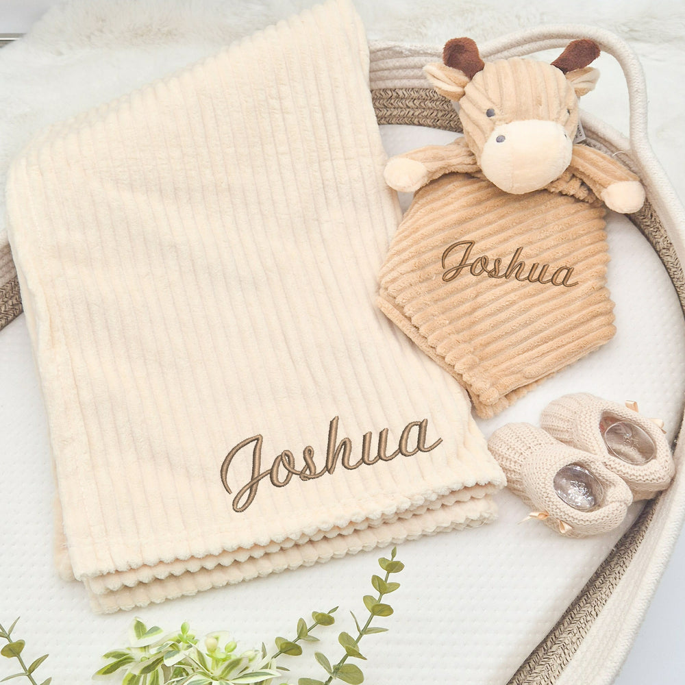 This beautifully curated baby gift set is a perfect blend of softness, charm, and thoughtful personalization. Featuring a cozy 75 x 90 cm blanket made from 100% polyester, it’s ideal for keeping little ones snug and warm. The set includes an irresistibly cuddly plush comforter with a friendly giraffe design, also embroidered with the baby’s name — adding a meaningful, personal touch. Its ribbed texture enhances both comfort and style, making it a treasured keepsake for any new parent.