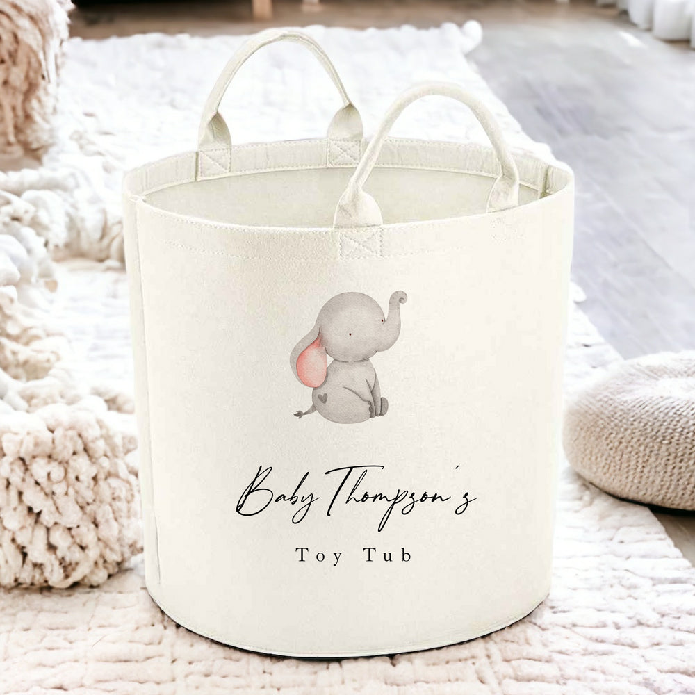 This custom grey elephant toy tub is perfect for keeping your child's toys organized and easily accessible. Personalize it with your child's name to make it truly special. Say goodbye to clutter and hello to an organized play space!