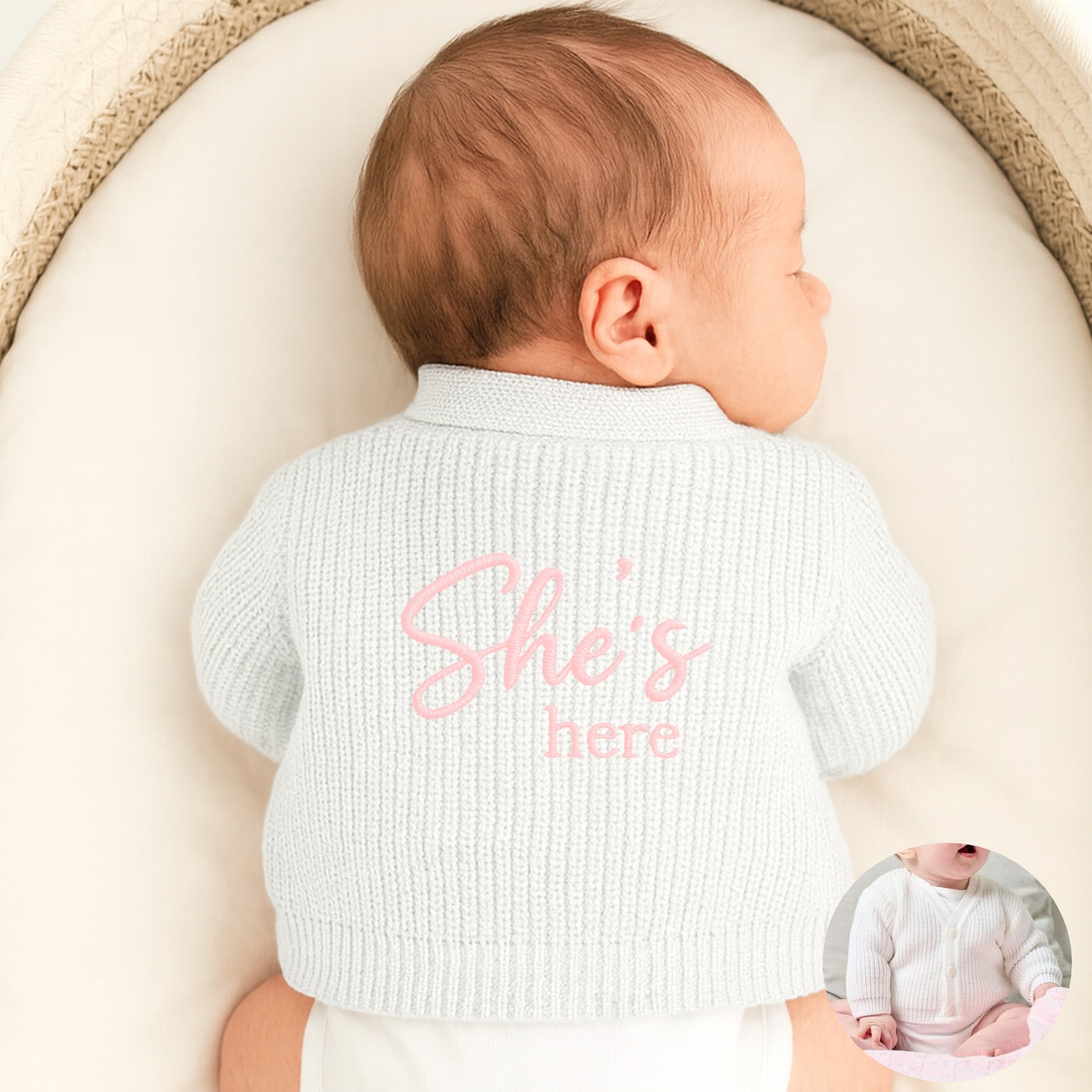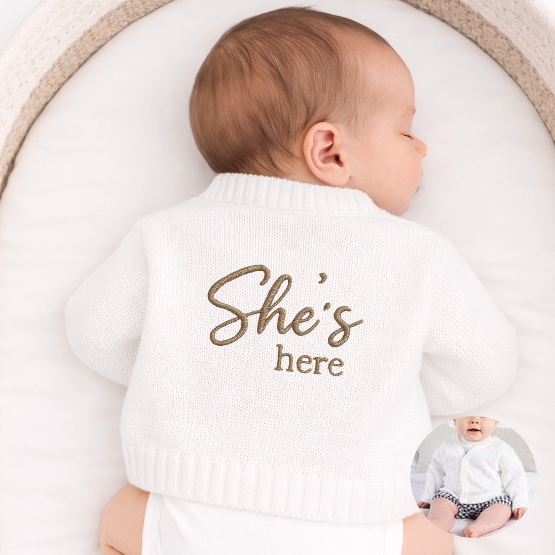 Announce the arrival of your little one in the sweetest way with this beautiful “She’s Here” embroidered knitted cardigan. Designed for newborns, this timeless baby cardigan is perfect for first photos, birth announcements, coming-home outfits and thoughtful new baby gifts. The delicate embroidered wording creates a keepsake piece parents will treasure.