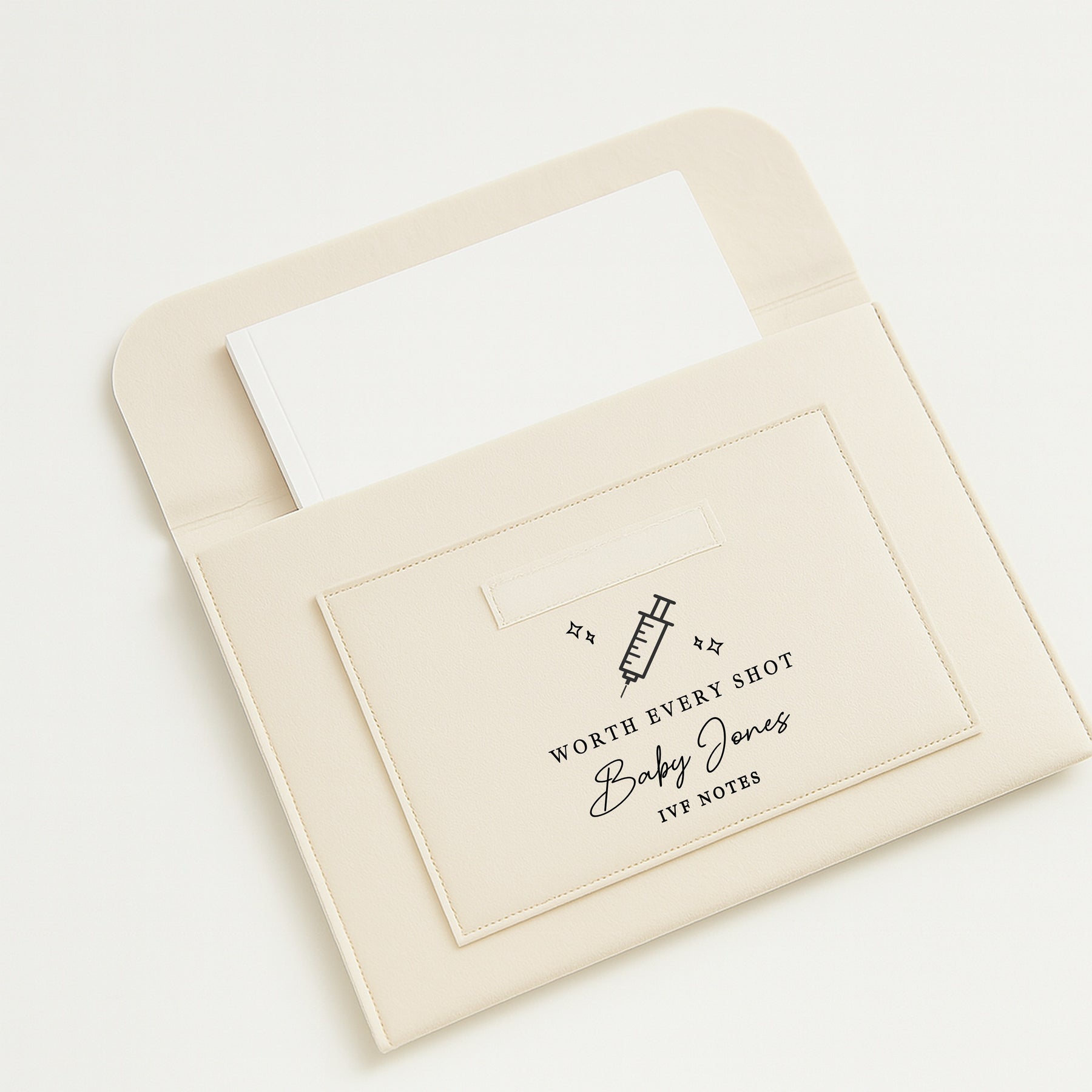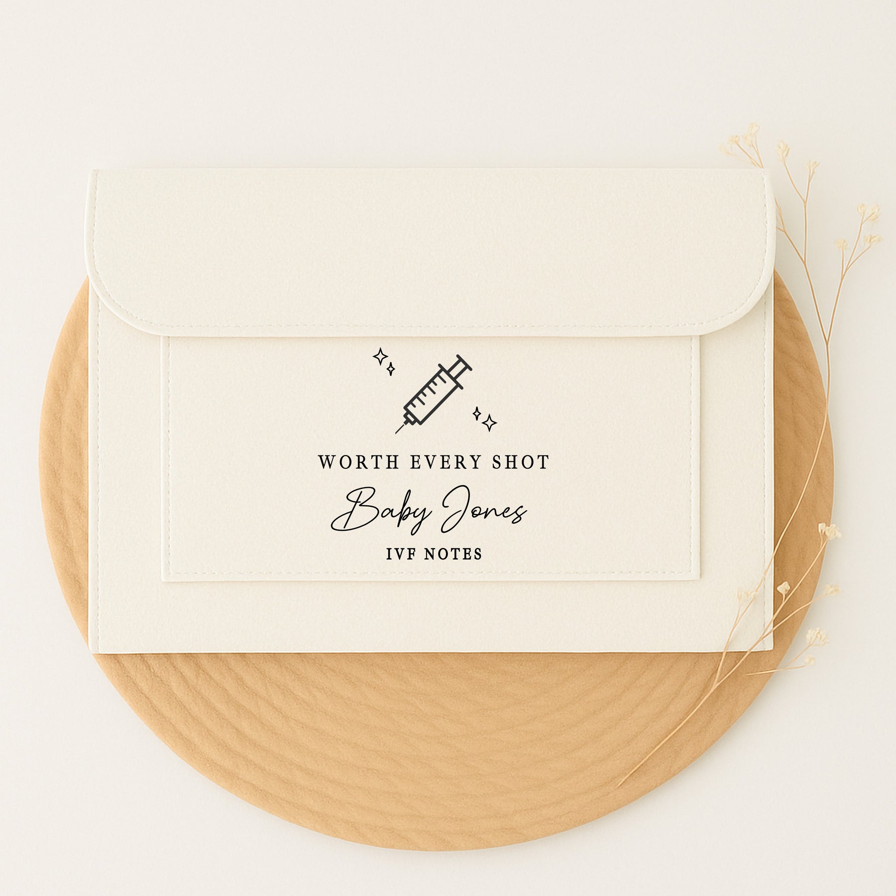 Organize all your fertility and pregnancy paperwork in one beautiful, practical folder. This cream felt IVF notes folder is perfect for women and couples on their IVF journey, TTC (Trying To Conceive), or early pregnancy. Designed to neatly hold all your medical notes, test results, scans, and important documents, it’s an essential companion through every step.