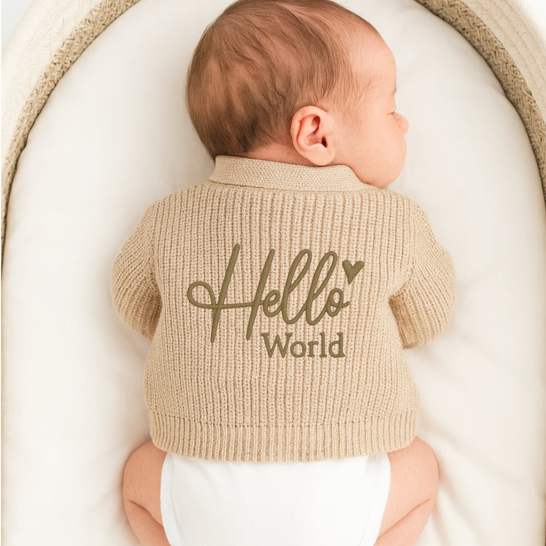 Personalised Beige Script Hello World Babygrow With Optional Matching Accessories