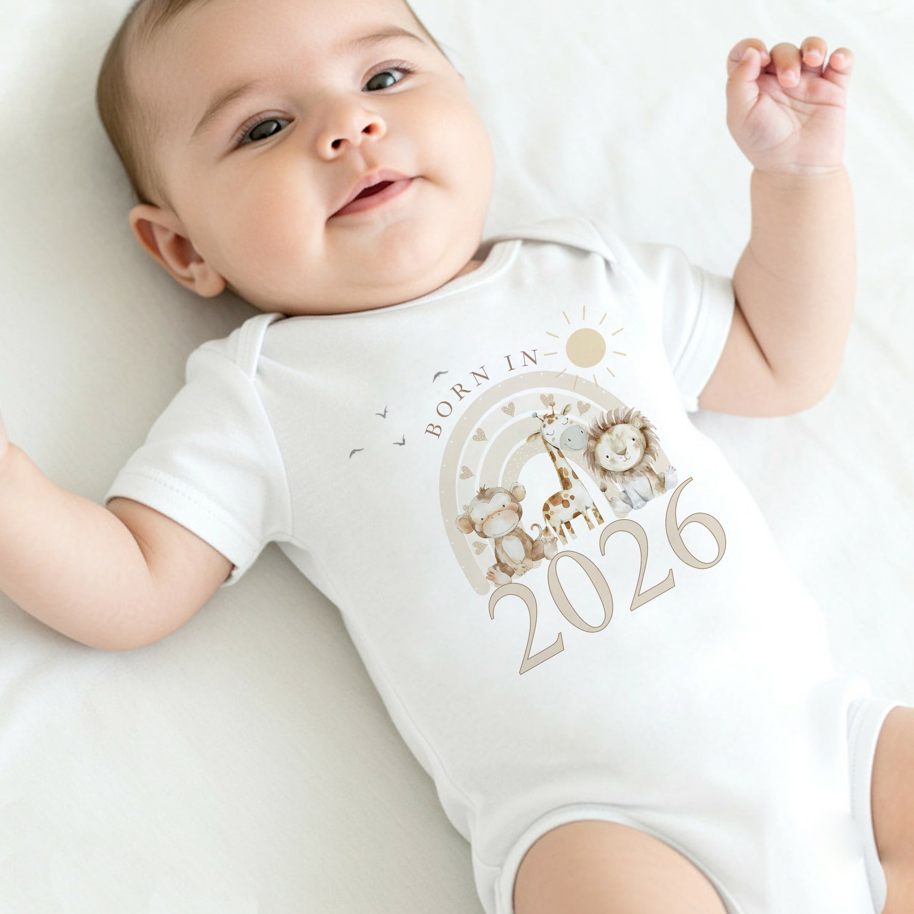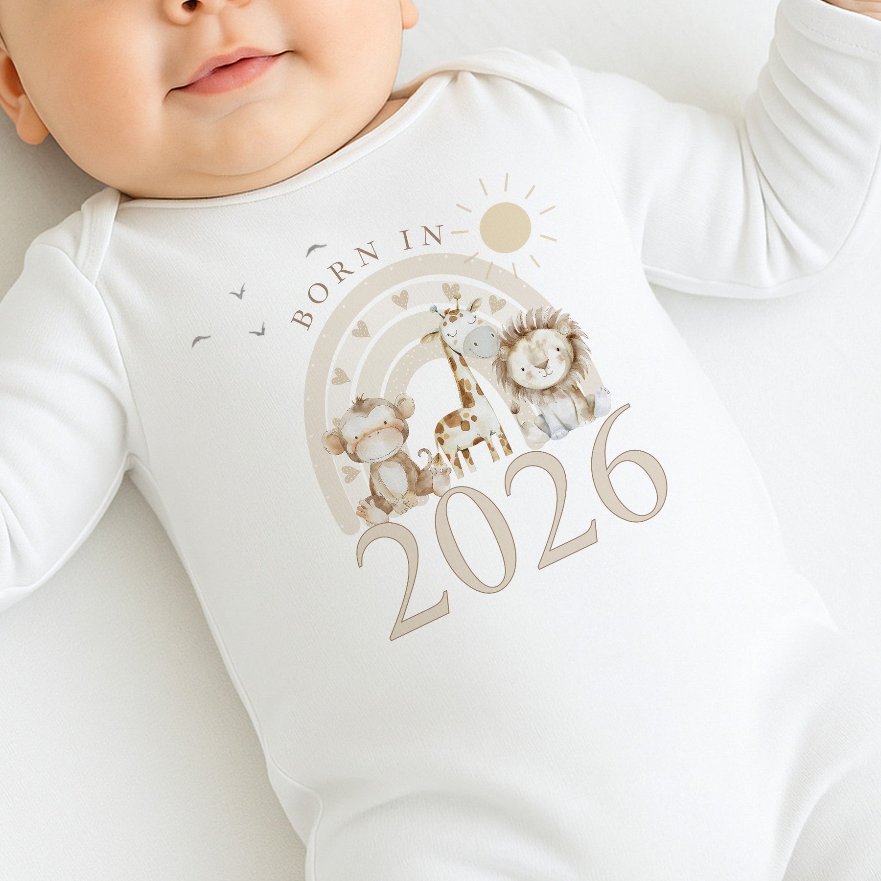 This Born in 2026 baby design features a soft neutral safari illustration with a monkey, giraffe and lion beneath a gentle rainbow. Perfect for a new baby gift, this timeless style suits both baby girl and baby boy and is ideal for baby showers, newborn outfits or keepsake photos. All items are sold individually, allowing you to choose exactly what you need.