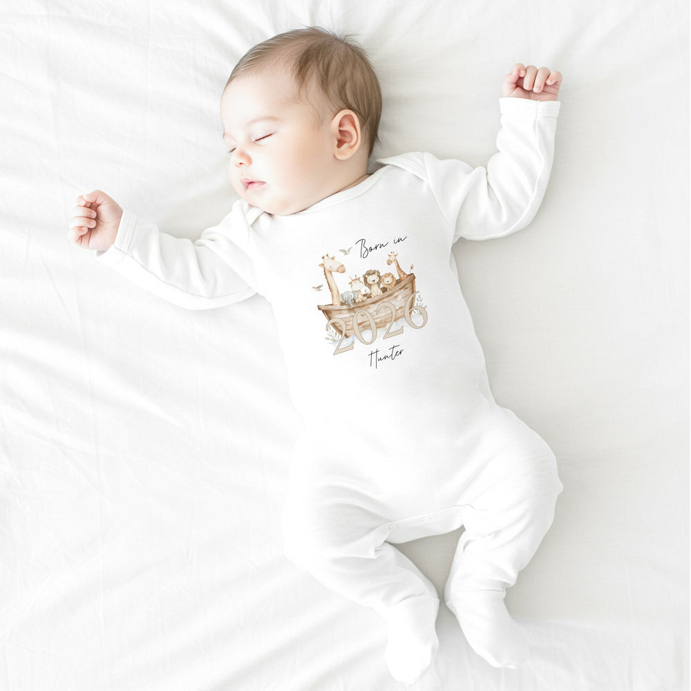 Personalised Animal Boat Born in 2026 Baby Grow, Vest or Bib