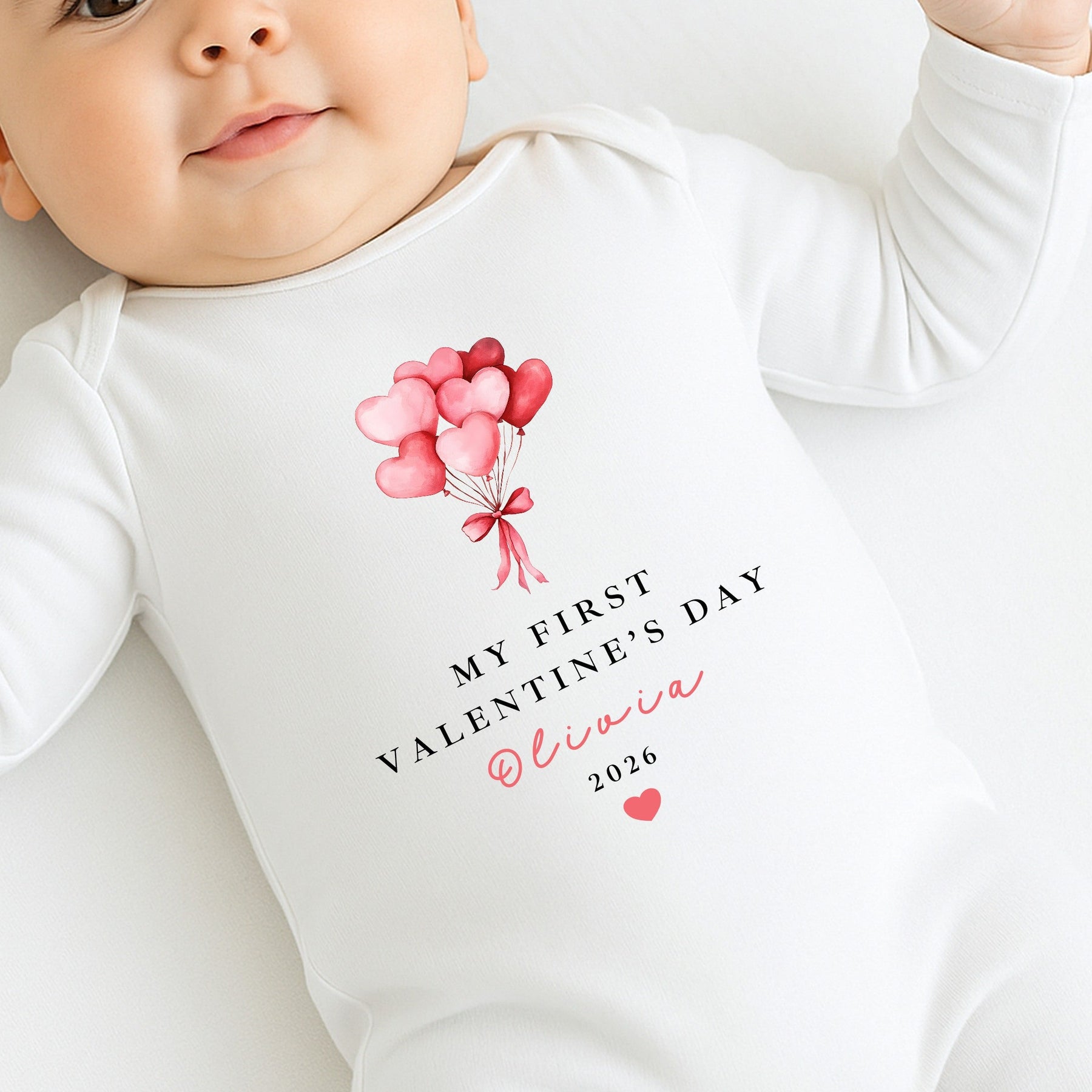 Celebrate your baby’s first Valentine’s Day with this sweet and timeless My First Valentine’s Day personalised baby outfit, featuring a soft pink heart balloon illustration. Designed to mark this special milestone in 2026, this beautiful keepsake is personalised with your baby’s name and year, making it a lovely choice for first Valentine photos, memory boxes, and meaningful gifting. Available as a baby vest, babygrow (sleepsuit), or bib, it’s perfect for newborns and babies celebrating their very first Valentine.