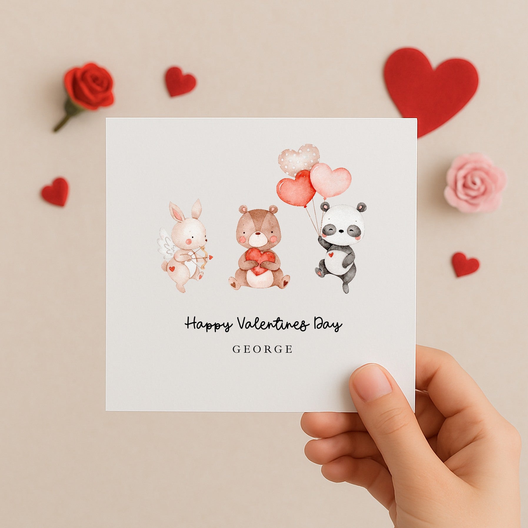 This personalised Valentine’s Day card features an adorable trio of animal friends — a bunny, bear, and panda — each holding sweet Valentine details. Finished with your child’s name printed on the front, this charming design makes a playful and heartwarming Valentine card for little ones.