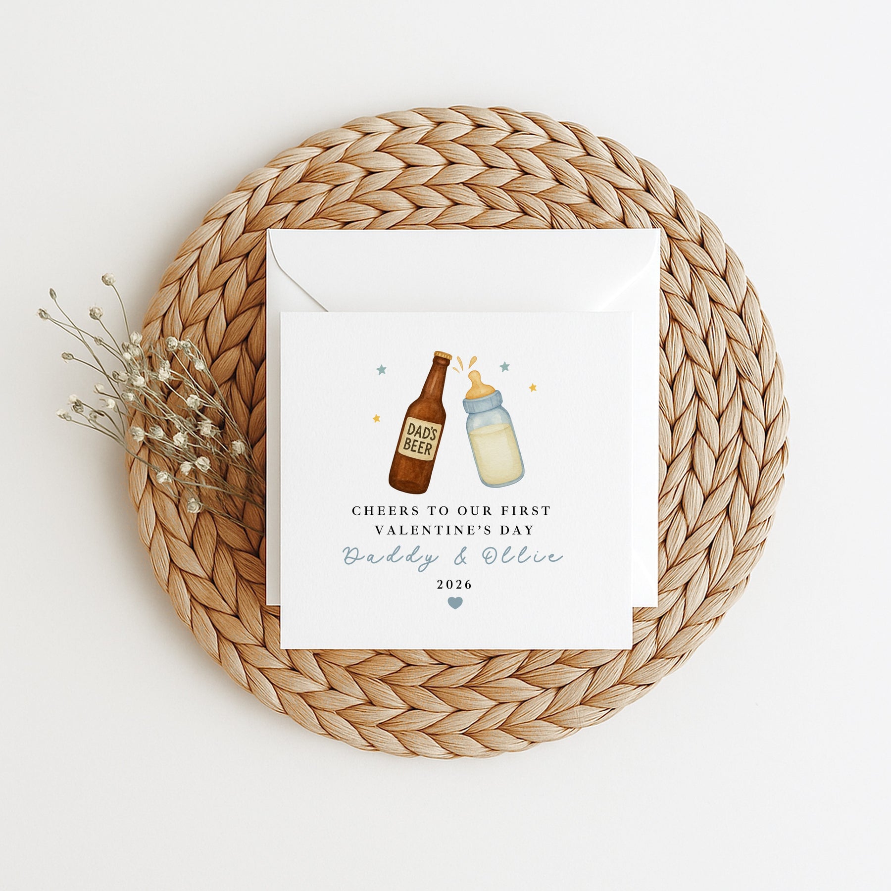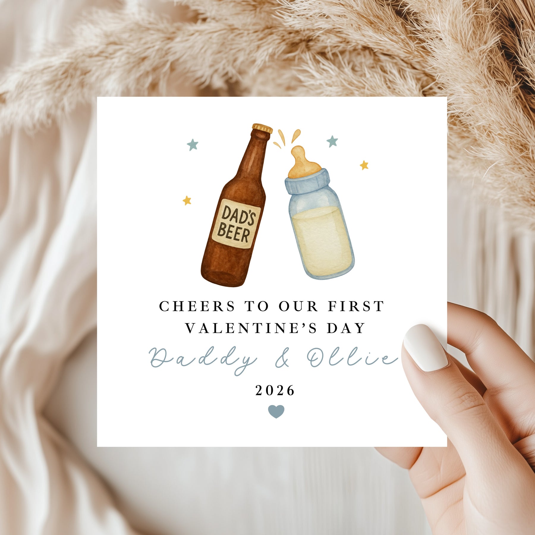 A sweet and playful First Valentine’s Day card for Daddy and Baby, featuring a charming illustration of a beer bottle and baby bottle clinking together. Personalised with names and year, this card celebrates a very special Valentine’s milestone.