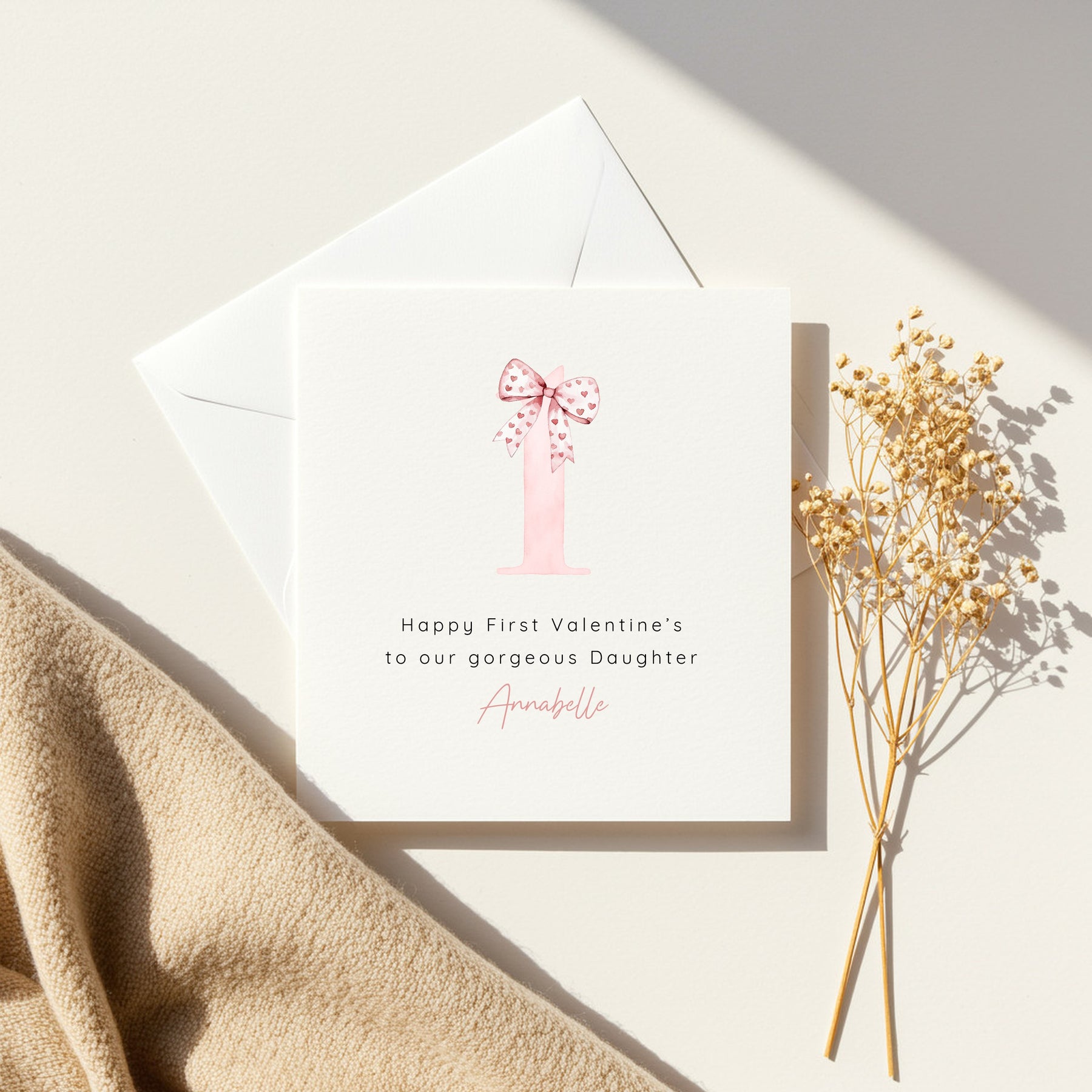 This personalised First Valentine’s Day card features a soft pink number “1” topped with a delicate bow illustration, finished with your daughter’s name printed on the front. The gentle pink tones and elegant design create a beautiful keepsake to celebrate a baby girl’s very first Valentine’s Day.