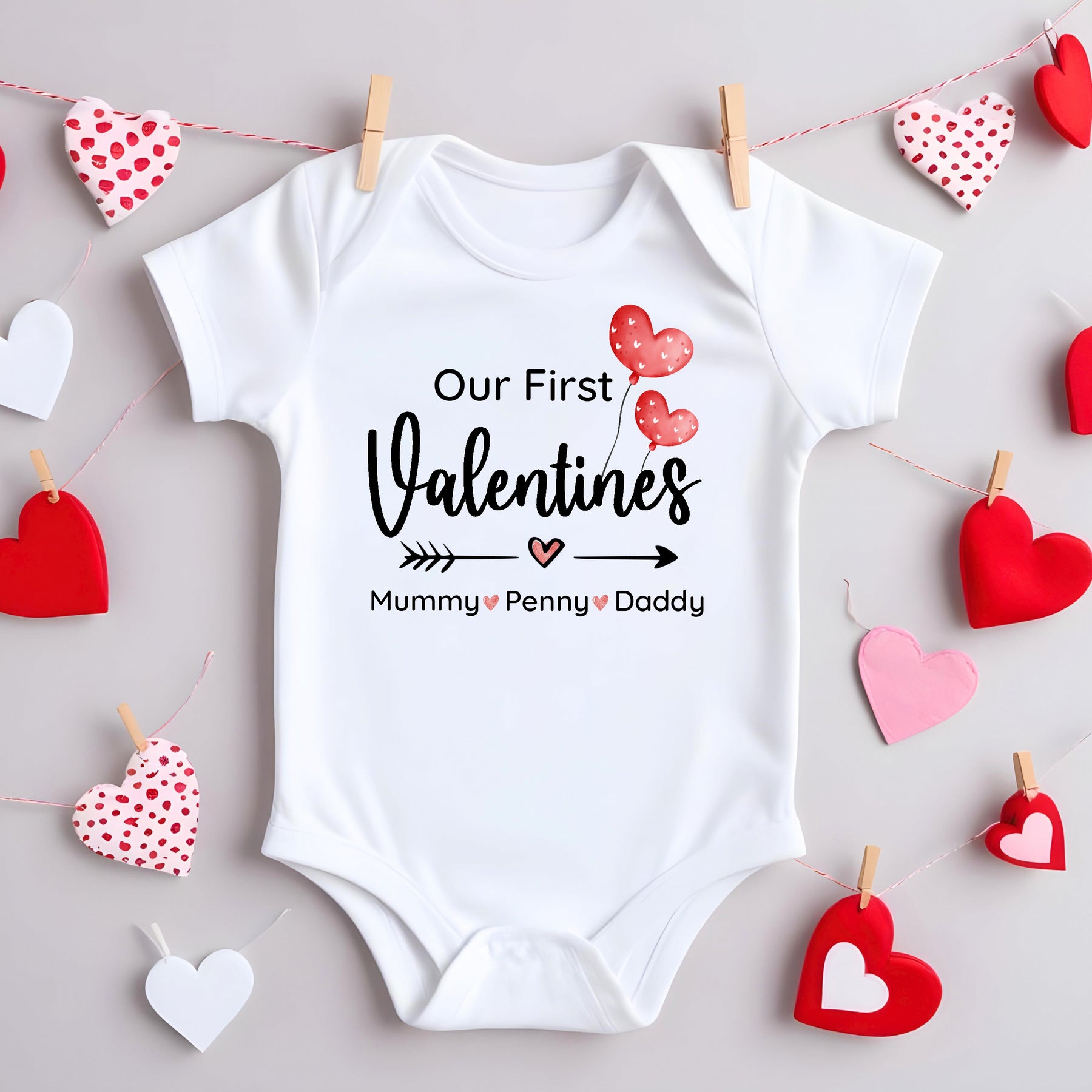 We will print: Adult T-shirt: Be my Valentine [NAMES] Baby Vest: Our Little Valentine [NAMES]
