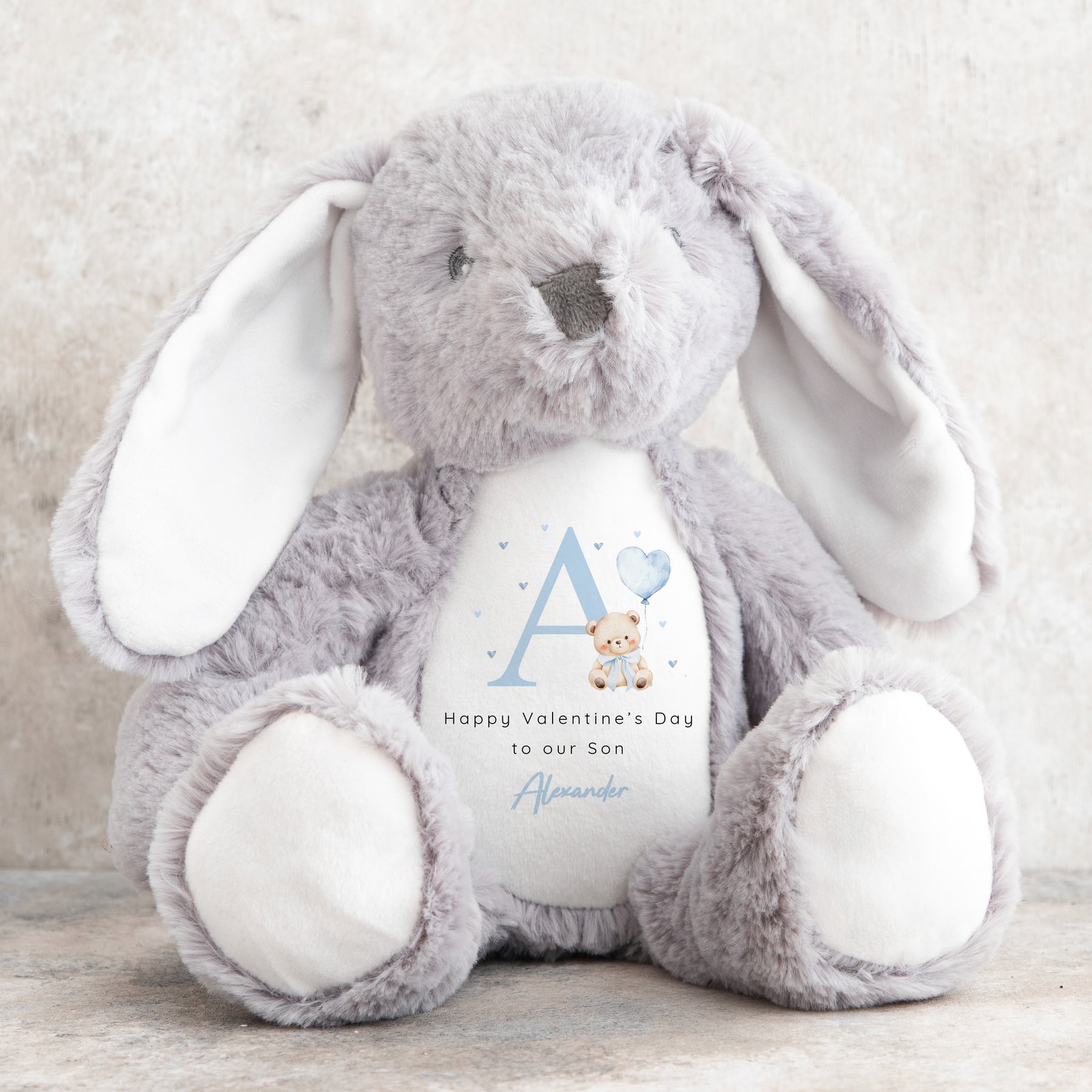 This listing is for a personalised Valentine’s soft toy, available in bunny or bear designs and finished in a choice of soft pink or blue colour themes. Each toy is customised with your child’s initial and name on the front, making it a meaningful keepsake for a baby’s very first Valentine’s Day.
