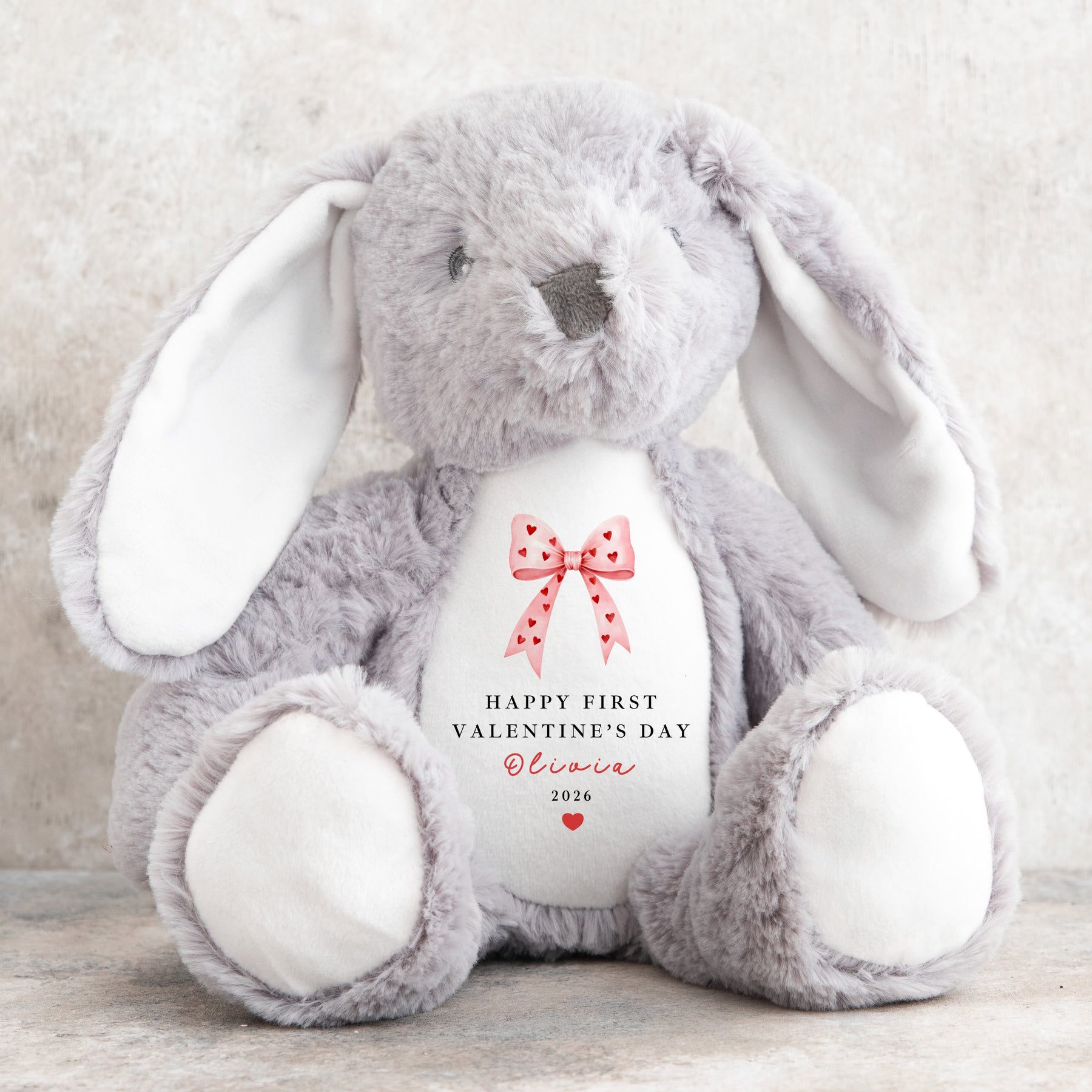 This personalised First Valentine’s Day soft toy features a sweet pink bow illustration with heart details, finished with your baby’s name and year printed on the front. Available as a plush bunny or bear, this charming design creates a beautiful keepsake to celebrate a baby’s very first Valentine’s Day.
