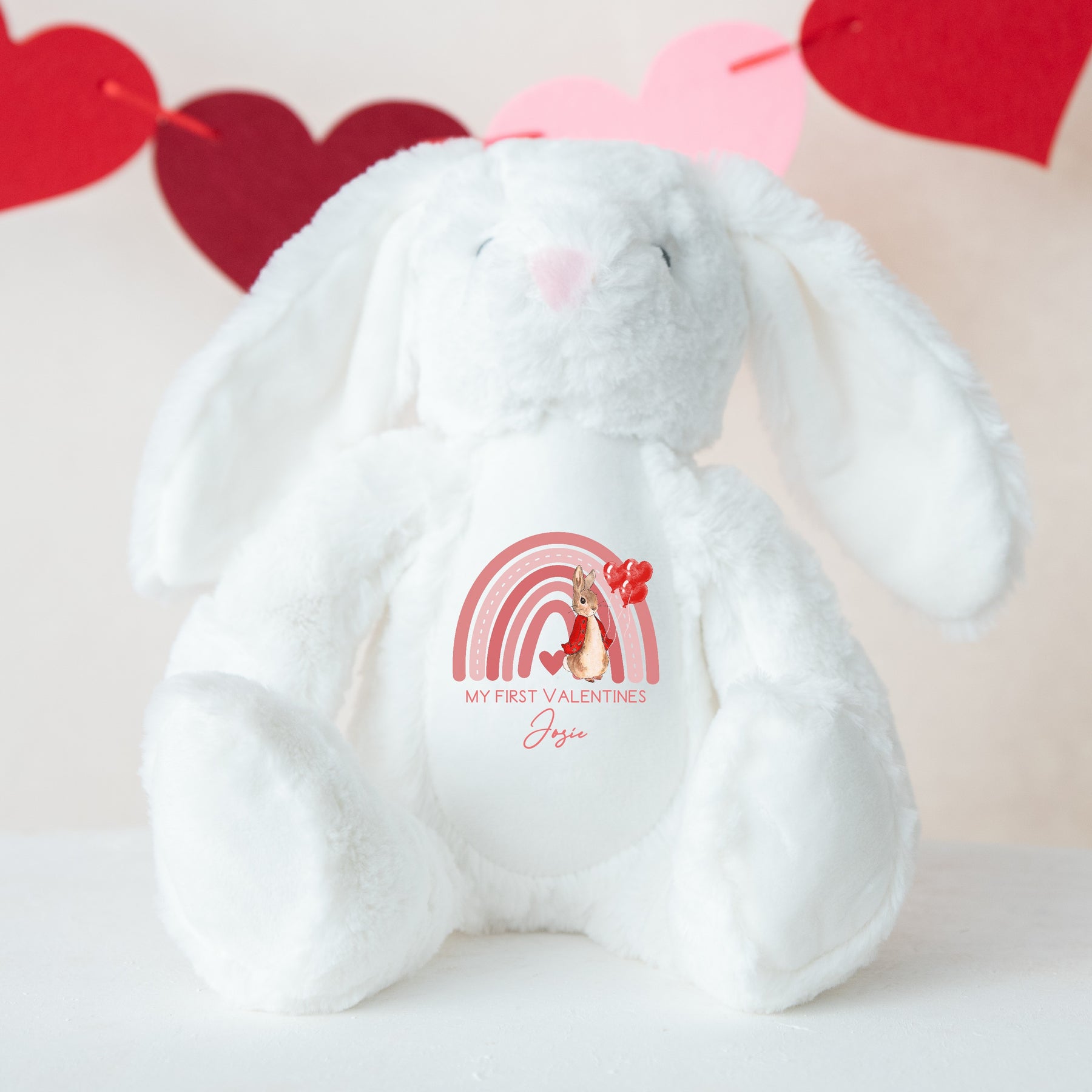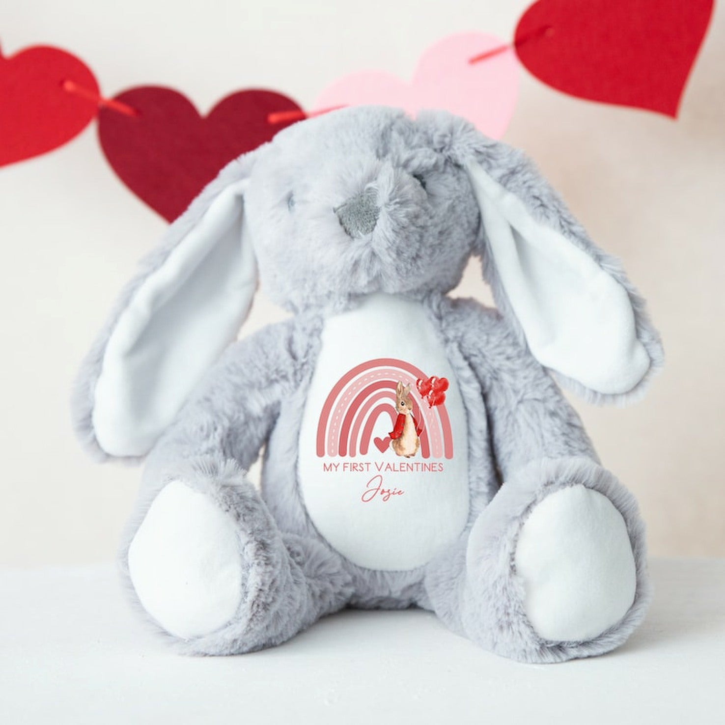 Make your Valentine's Day unforgettable with this adorable personalised bunny teddy bear. Featuring the words 'Our First Valentine's' and customizable with your chosen names, this cute and cuddly bunny will be treasured for years to come. Celebrate your love in a unique and meaningful way.