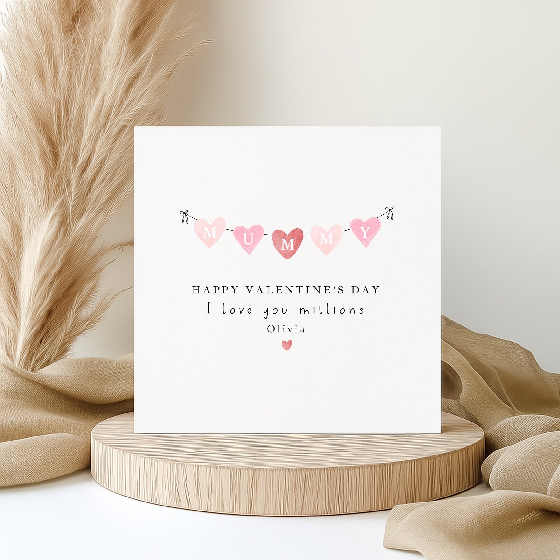 This square 6×6 inch card is printed on smooth, high-quality card stock and features a pink heart banner spelling “Mummy”, finished with your chosen name beneath. The card is blank inside for your own message, folds neatly, and comes ready to gift with a white envelope included. A timeless personalised Valentine’s keepsake card for mum.