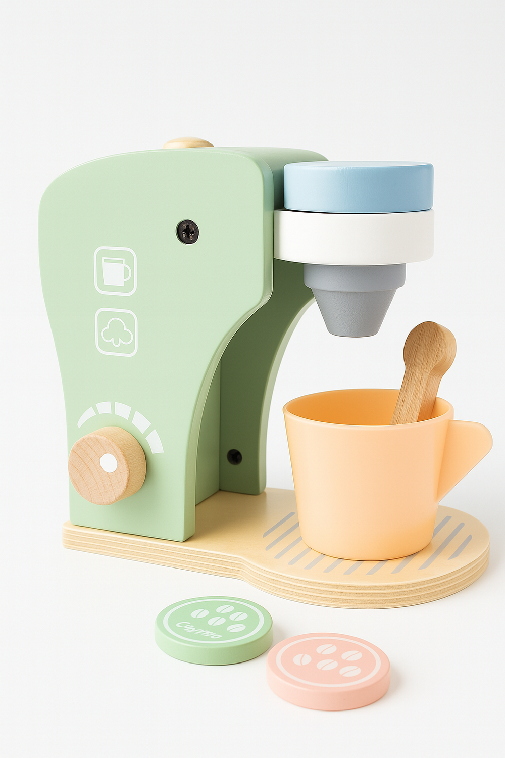 Brew up some fun with this charming personalised wooden toy coffee machine, designed especially for imaginative toddlers aged 24 months and up. This beautifully detailed set includes a pastel green coffee maker, a milk carton, two wooden drink pods, a cup, and a stirrer—everything your little barista needs to start their day! With interactive knobs and removable accessories, children can engage in pretend play while developing fine motor skills, creativity, and social interaction. Fully CE tested, this toy meets all UK safety standards, giving you peace of mind while your child enjoys safe, hands-on learning.